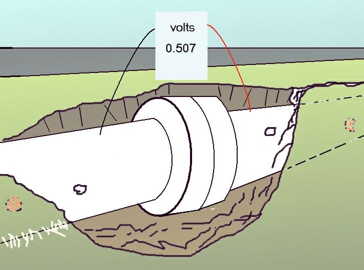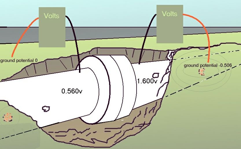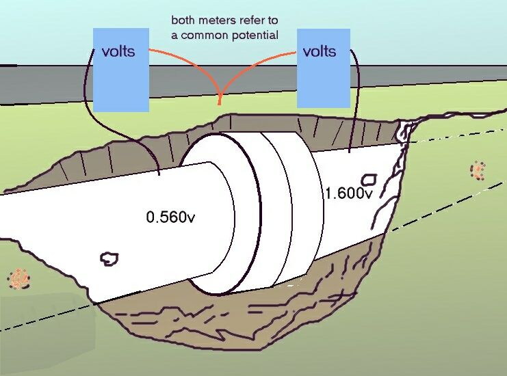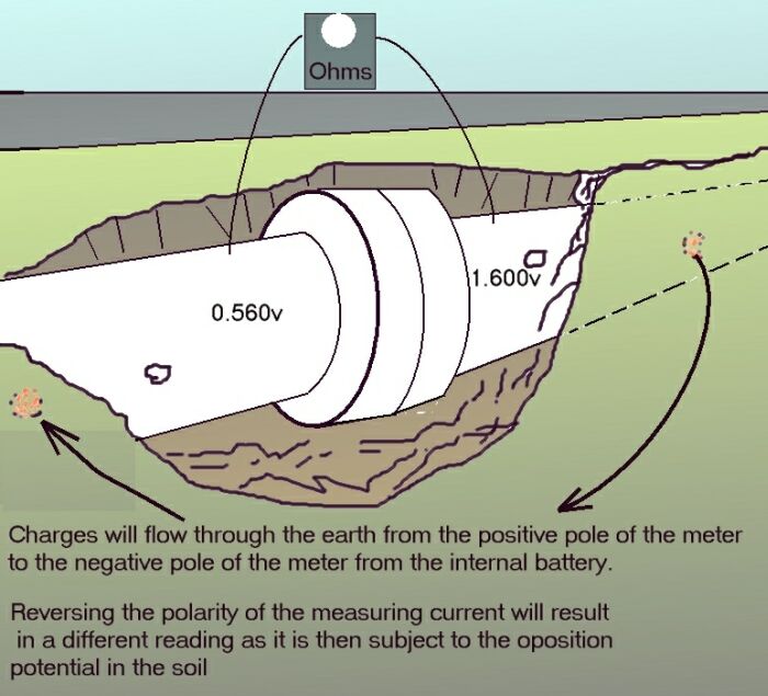The surface area of the coating fault determins the amount of current caused by the corrosion reaction at the active interface and the resistance at the other. The reading on the meter is the result of the sum of all componentsin the measuring circuit so we can not use the 'amps' value in Ohms law to calculate the earth resistance. All we can measure is the total measuring circuit resistance and that includes an EMF that is directional and therefore polarity must be considered an any calculation.