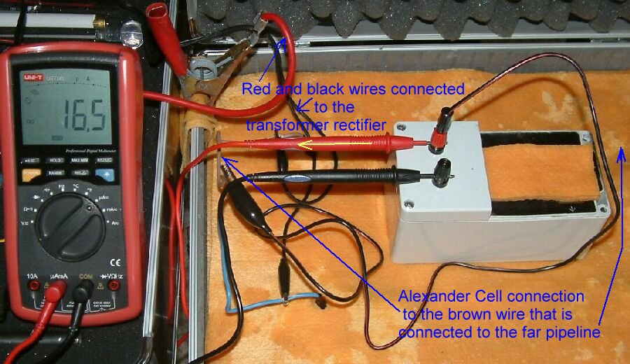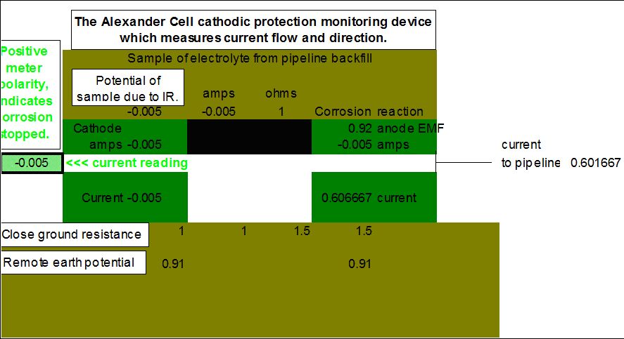 The circuit of the Alexander Cell includes an earth path which allows the whole corrosion cell to be influenced by the current, locally available from the cathodic protection system. The effect of this influence can be seen on a current meter in a closed circuit condition.