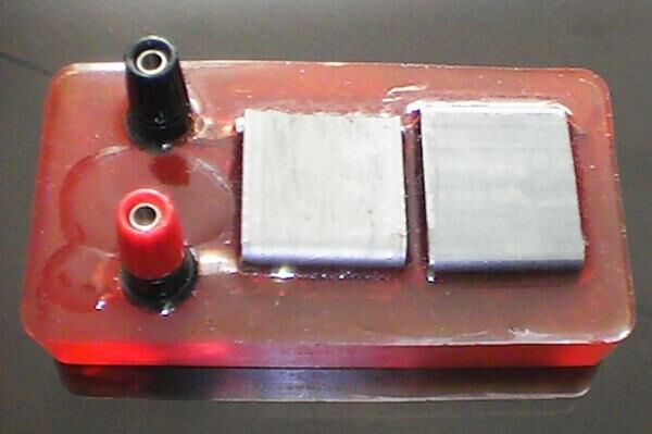 Two of the electrodes are on the top of the device and the other two form the base. One of the top electrodes is cleaned, to bright metal, before use, and the other remains untreated.