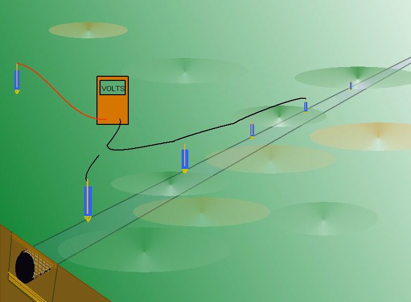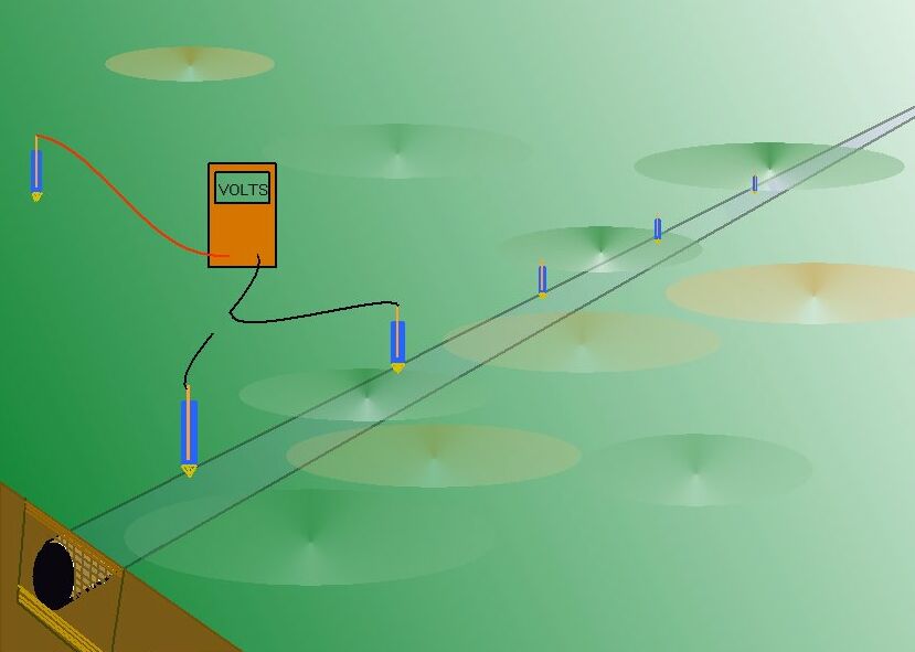 4.3.1. Contact the ground with the roving electrode, at one meter intervals along the path of the pipeline, noting the voltage readings between the electrodes, at each step.4.3.2. The locations of highest voltage should be marked.