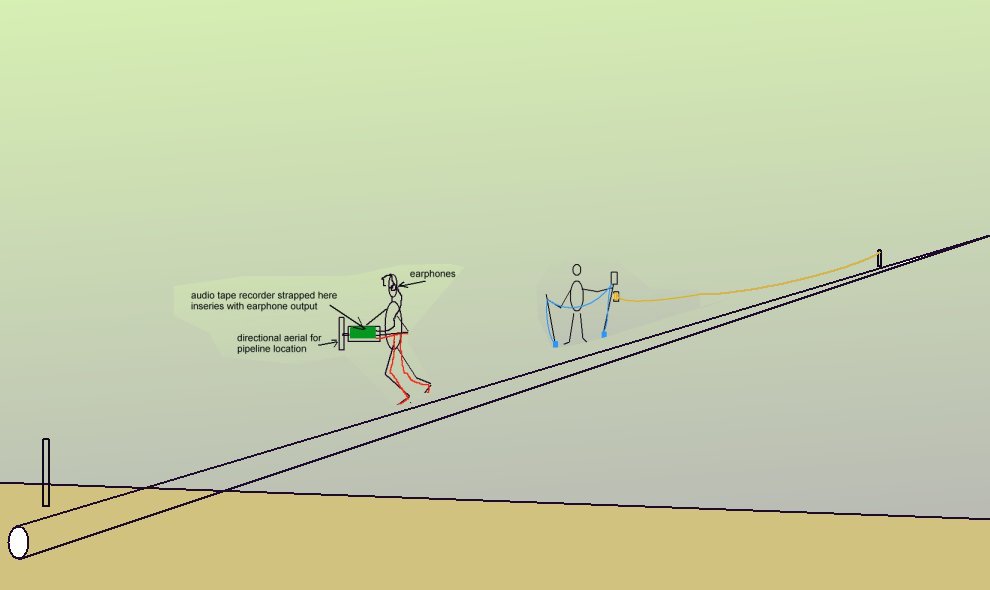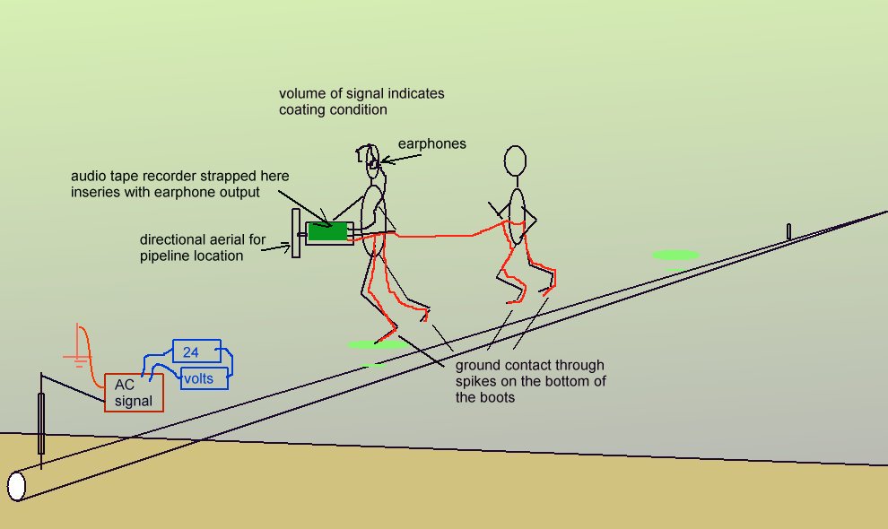 We used a Pearson type instrument for pipe location and to give a secondary indication of the positions of coating faults. This equipment was supplied with earphones through which the operator judges the volume of the monotone that was impressed into the pipeline at the nearest metalic contact point.