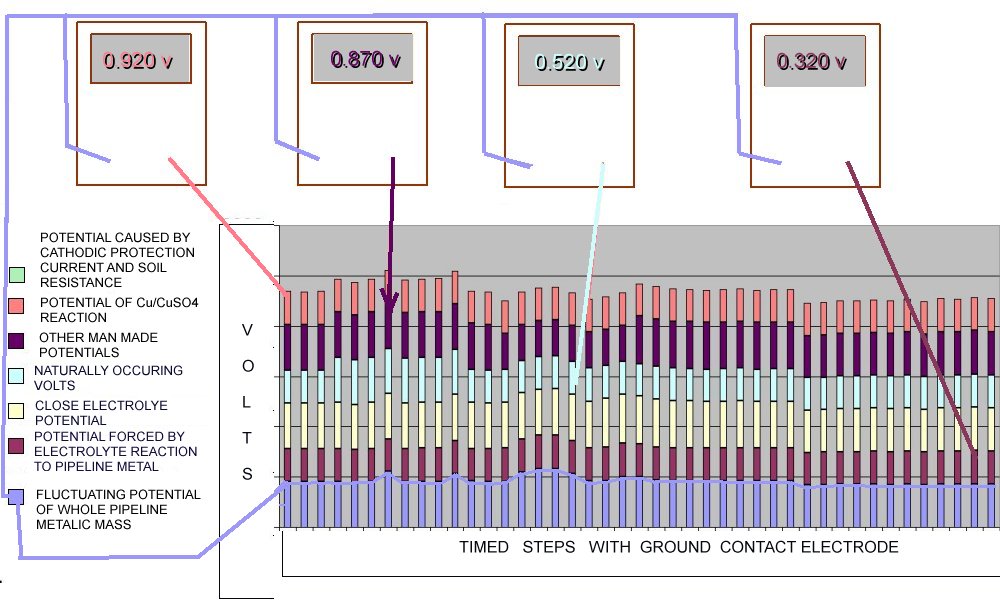This graph just shows voltages recorded at time intervals and sometimes synchronised through the GPS satelite system to the switching mechanism at the source of the cathodic protection current.