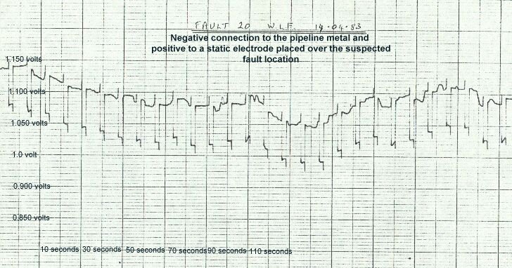 The top trace shows the potential difference between the whole of the pipeline and the ground at each point of contact while the impressed current is switched on.