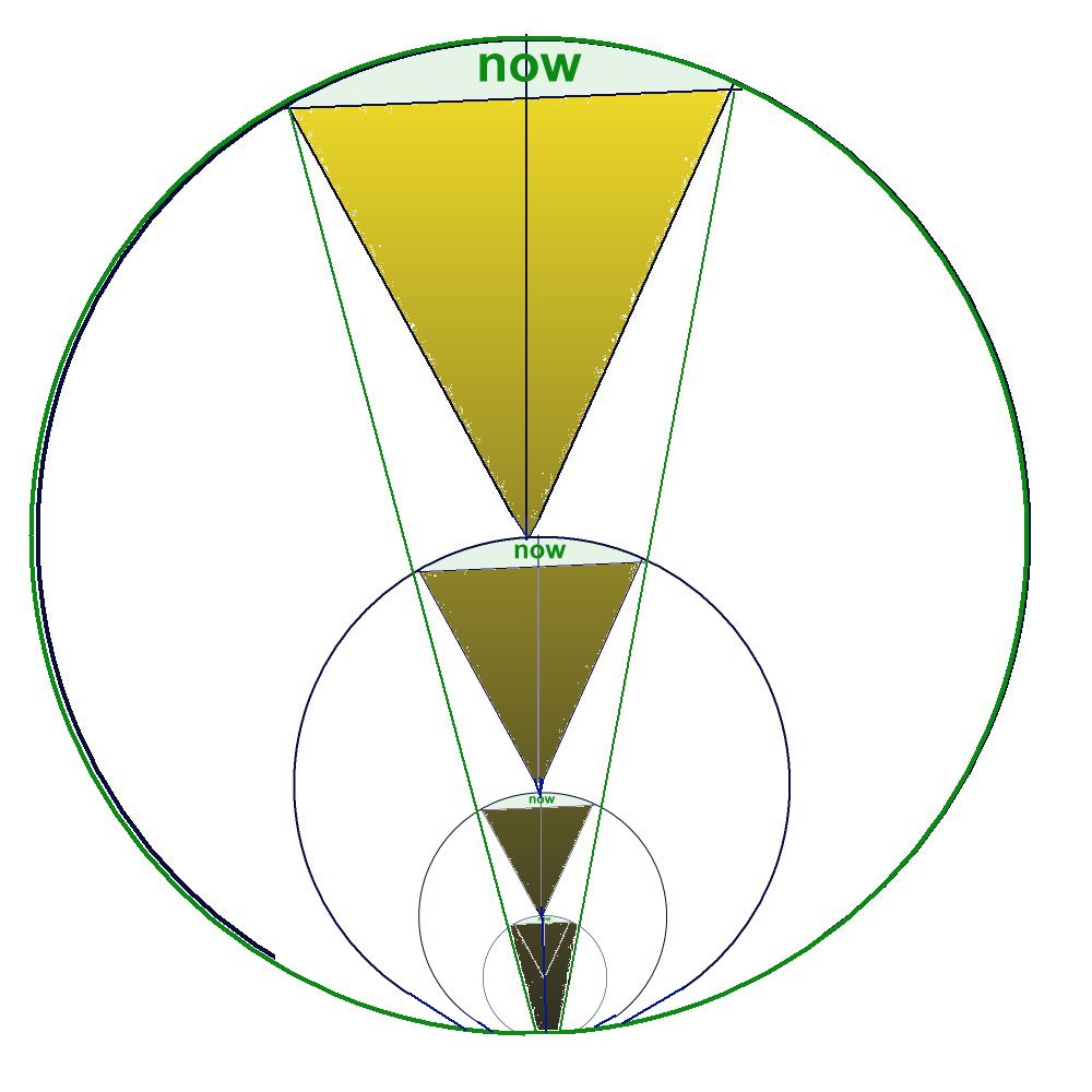 This is made clear by the following picture that shows the cones of events progressing into the future from the past that is getting relatively smaller.