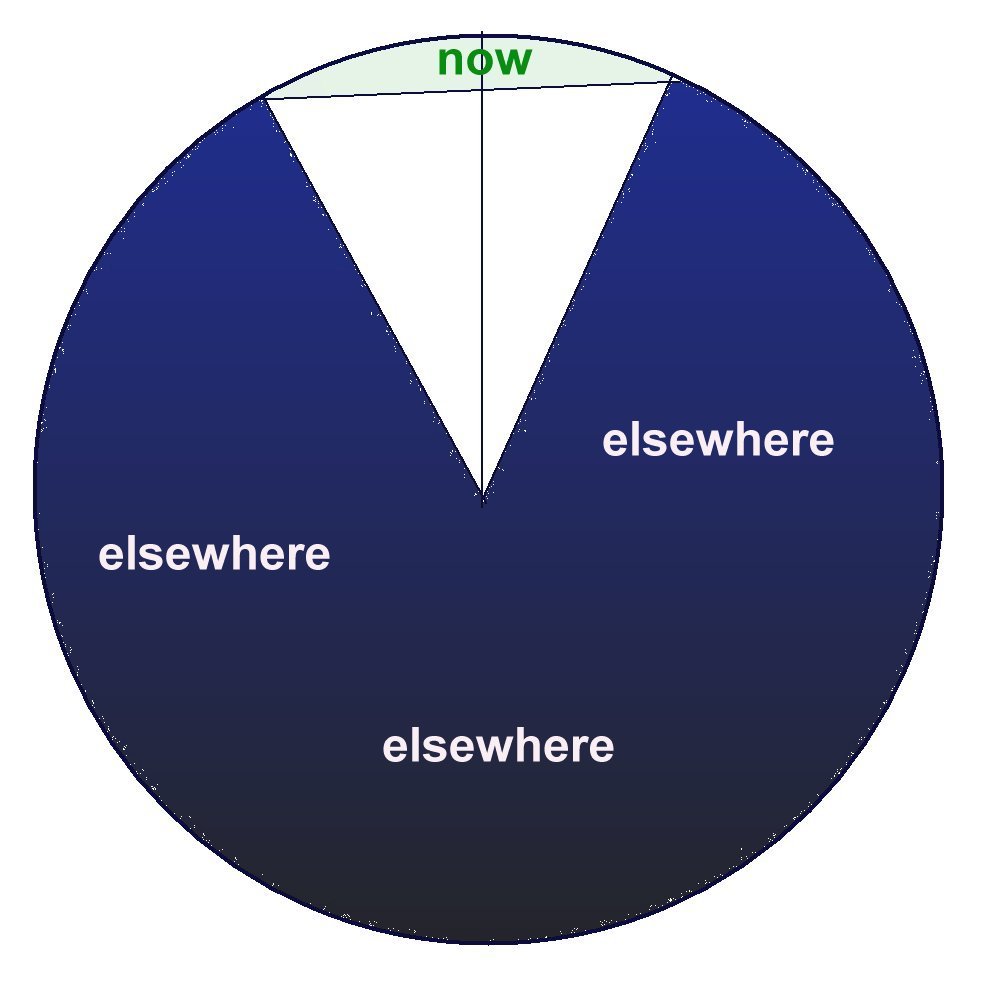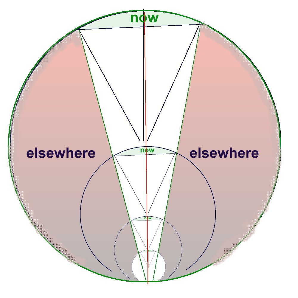 This next picture shows the concept of 'elsewhere' that I prefer to describe as sideways time. The sentient observer can be aware o the existence of cones of events outside of perception but not have any data relating to them.