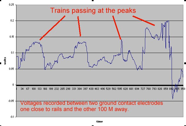 We placed one half-cell on the railway embankment and another 100m at 90 degrees to the railway and recorded the voltages at 2 second intervals.