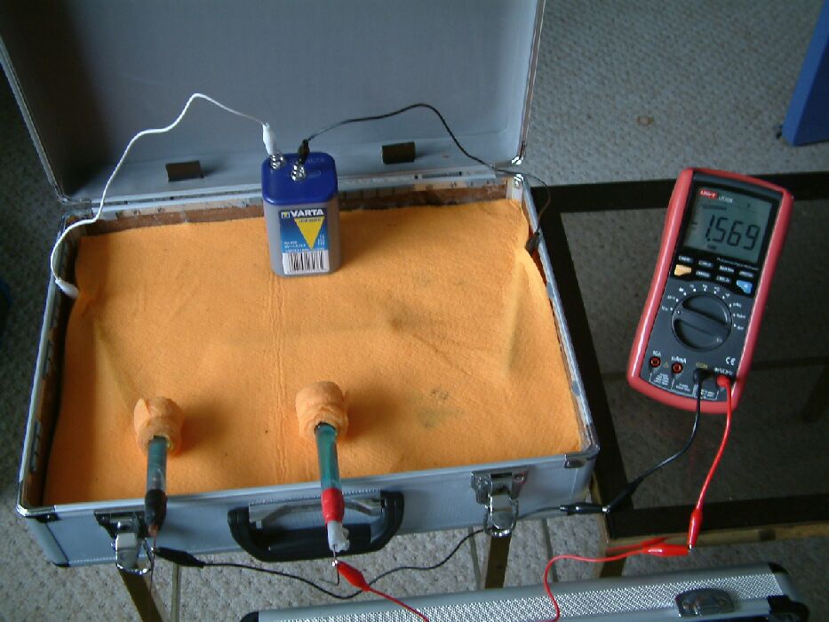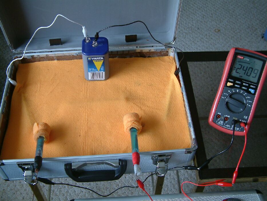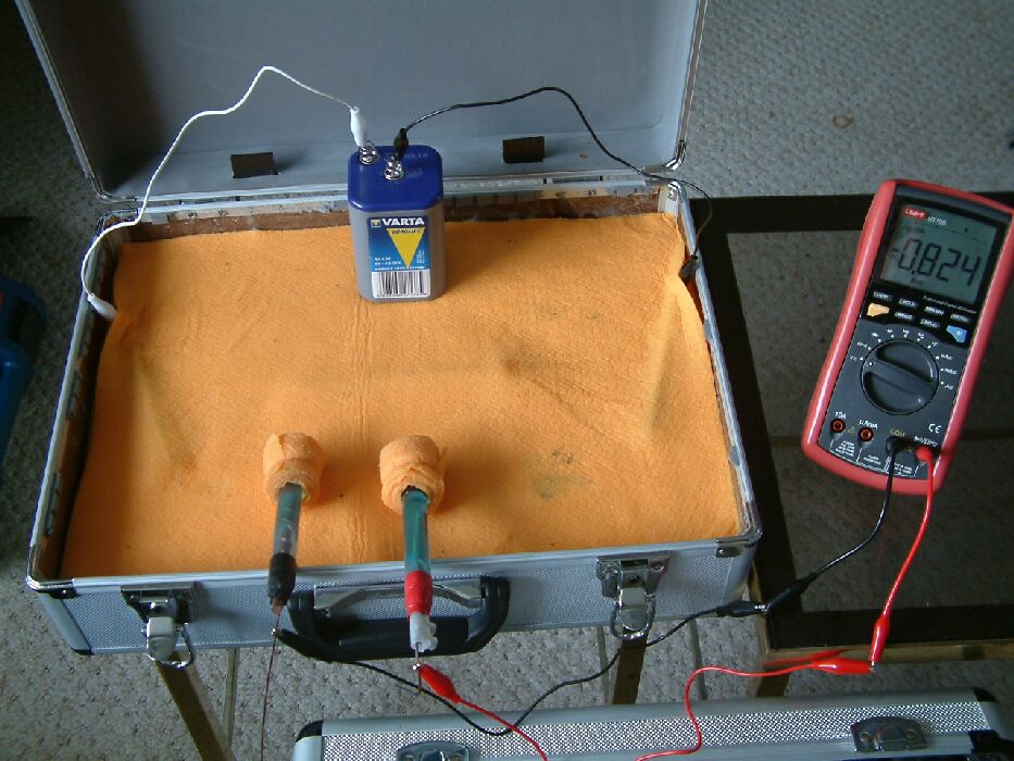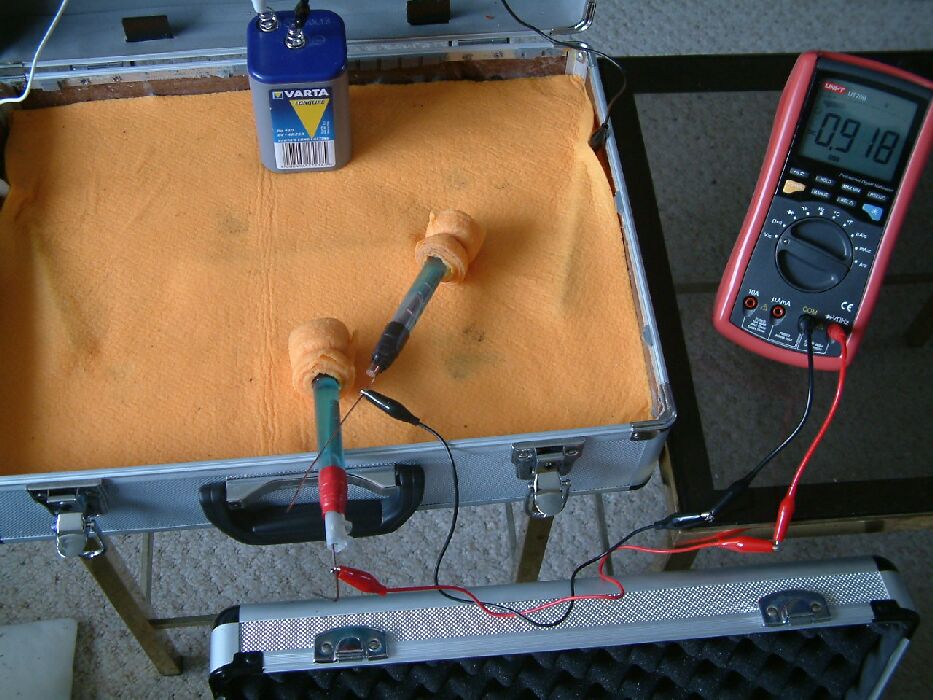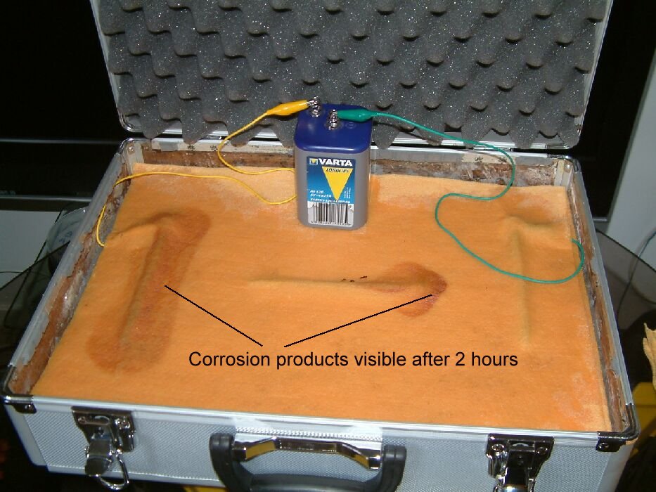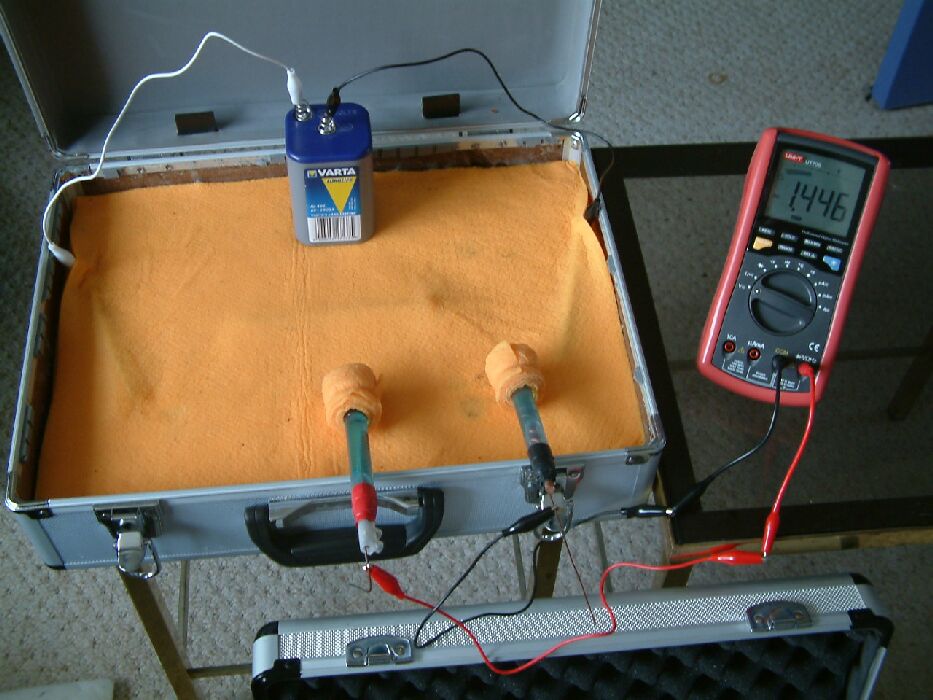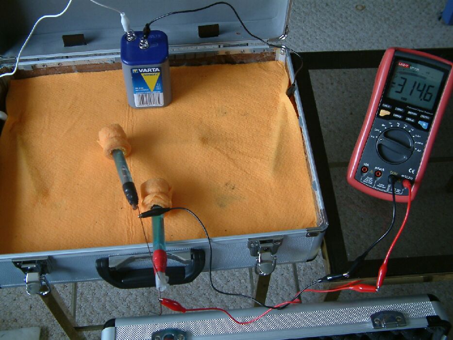During the three hours that it takes for the corrosion products to become visible, measurments are carried out using a multimeter, probes and copper/copper-sulphate electrodes.