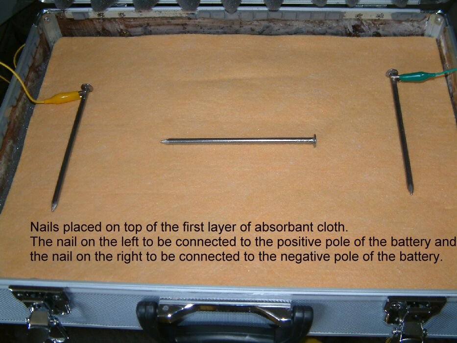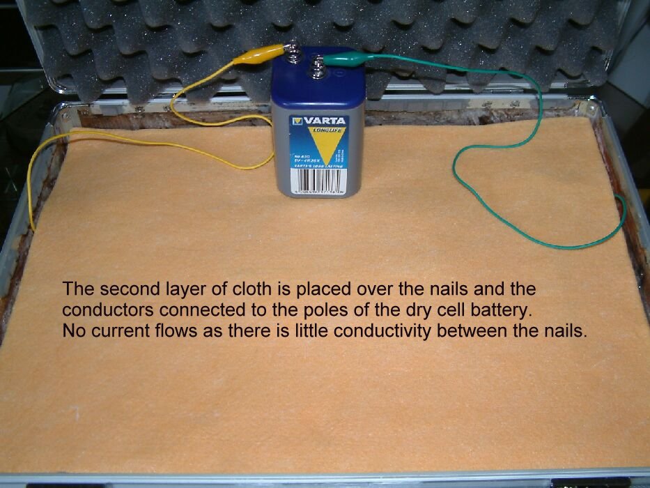The positive pole of a six volt dry-cell battery is connected to the nail on the left hand side of the cloth and the negative pole connected to the right hand nail.
