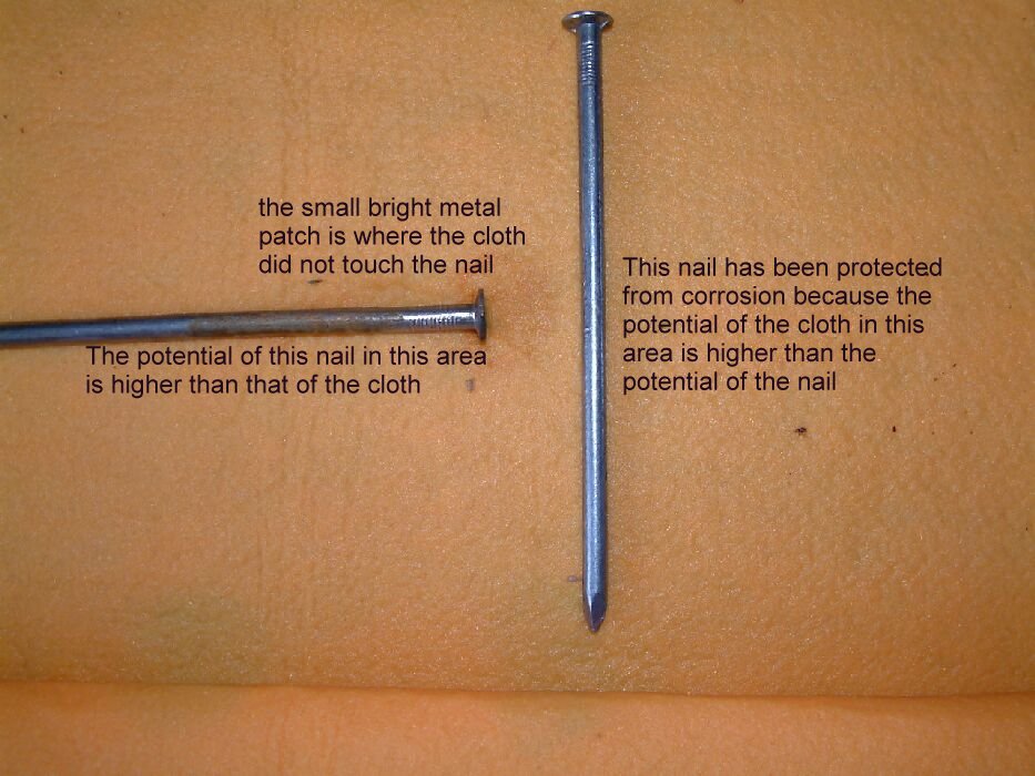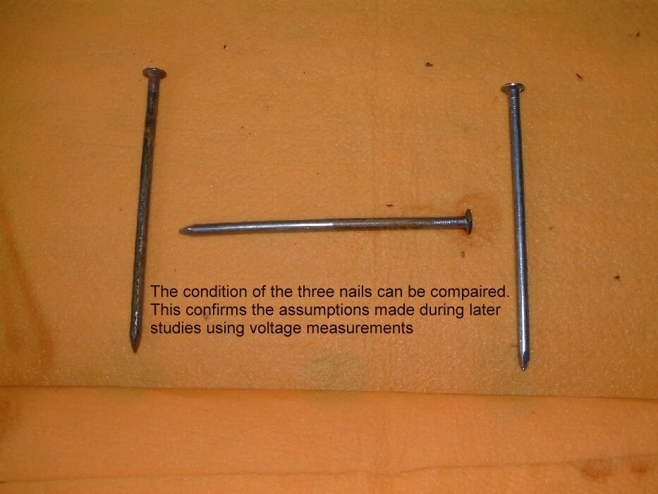 The picture below shows the corrosion product and the corrosion itself on the nails. It also shows the cathodicly protected nail to be bright and shiny with no sign of corrosion.