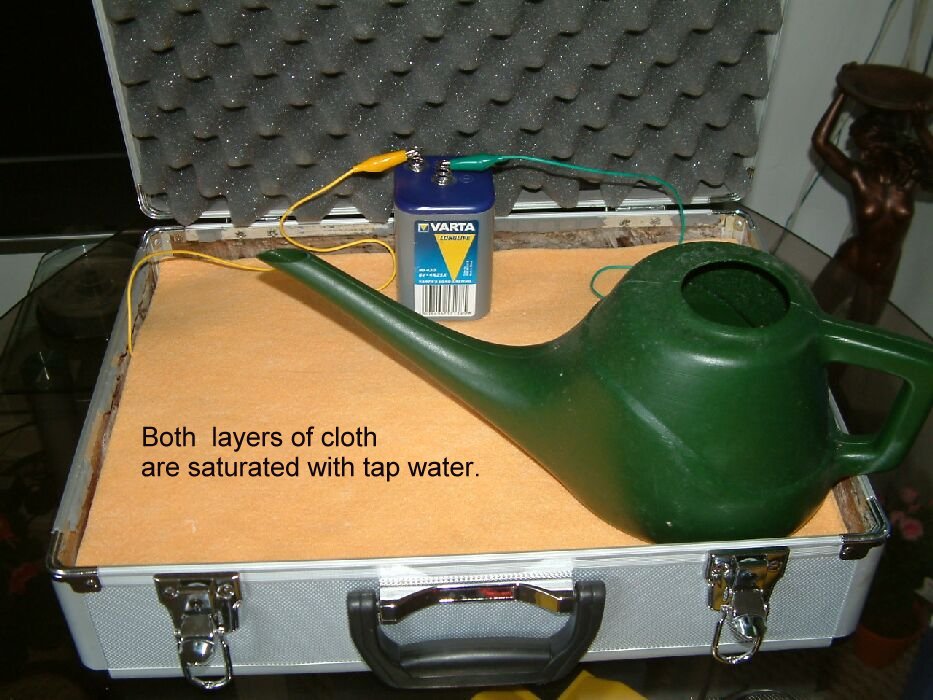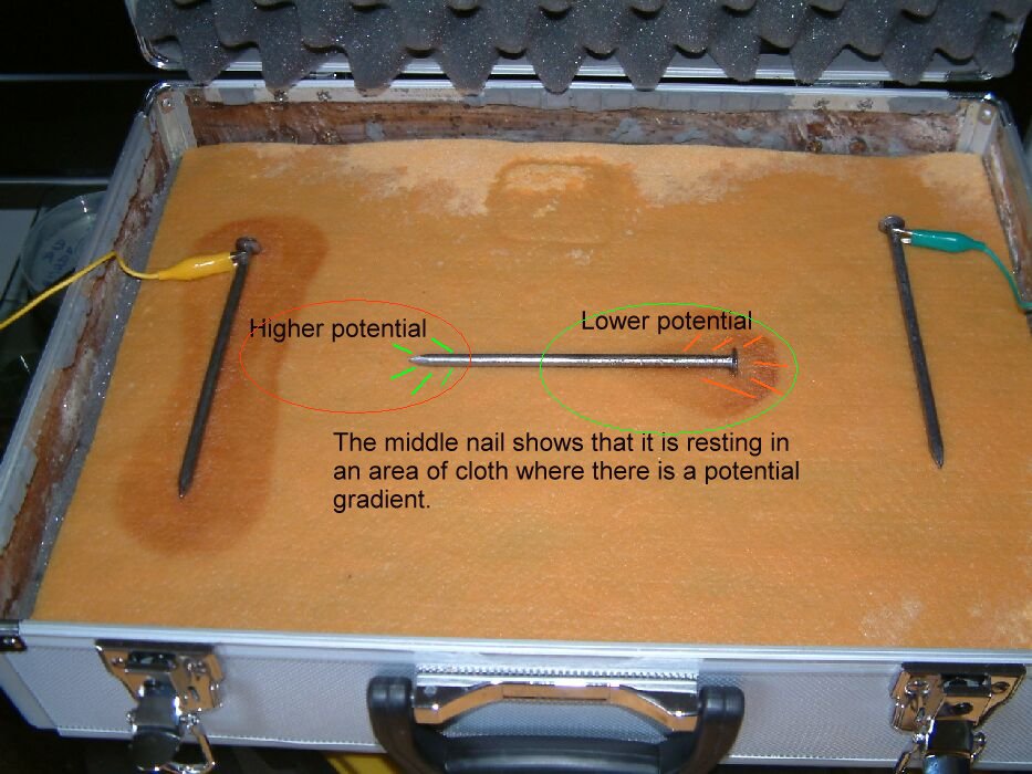 It can be seen by the variety of readings shown in these pictures that it is possible to plot the isopotential lines all over the cloth and discover the path of the direct current from the right hand nail to the left.