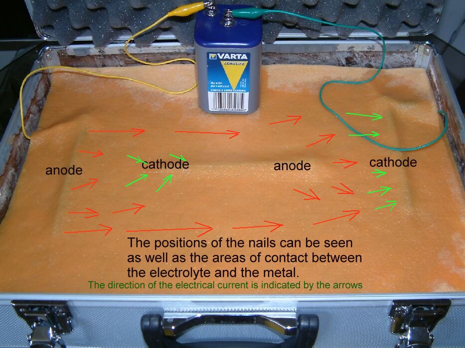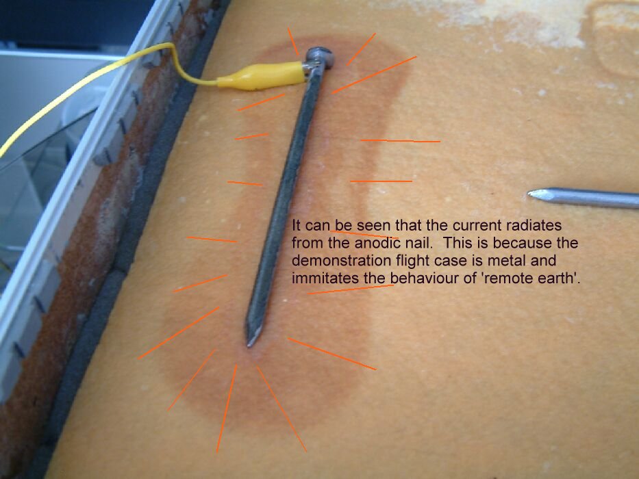 This first demonstration piece shows the flow of direct electrical current passing through the electrolyte in 'open circuit' and causing corrosion where it leaves the conductive metal. It also shows how current flowing on to metal stops corrosion by making it cathodic while current flowing from the metal accelerates the corrosion leaving visible corrosion products within 2 hours.