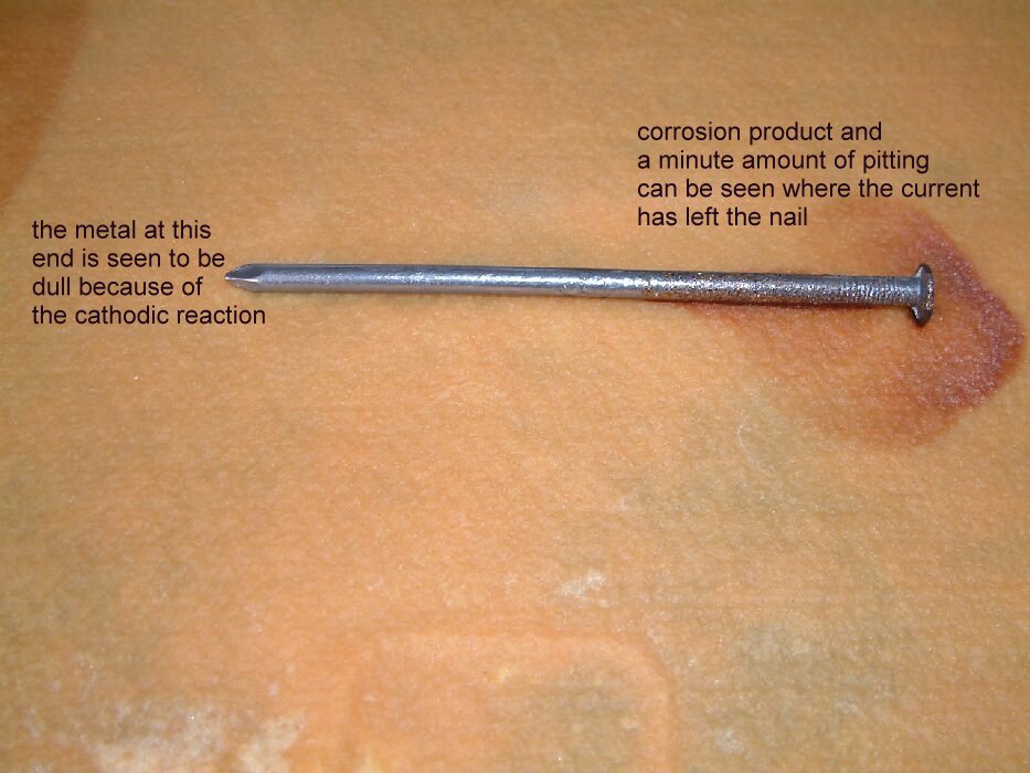 The nail in the centre is seen here to have corroded at the end closest to the cathodicly protected nail. The small shiny area is where there was no contact with the electrolyte.