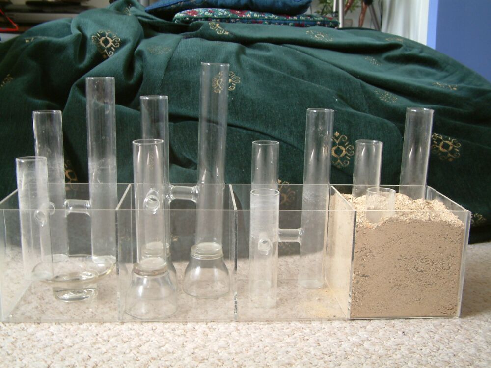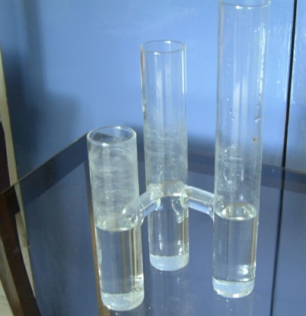 We have four glass flower vases, each being three tubes joined so that water can level out in each tube.