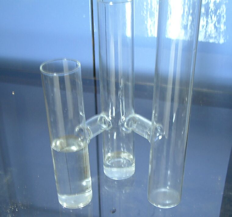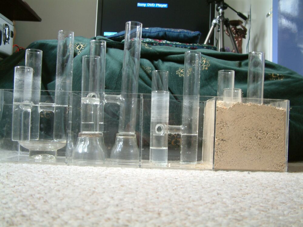 A side view of the water model shows that the level of each main compartment is different and the level of each of the tubes might be different in relation to the bottom of that tube.
