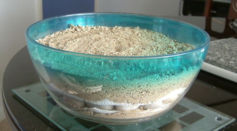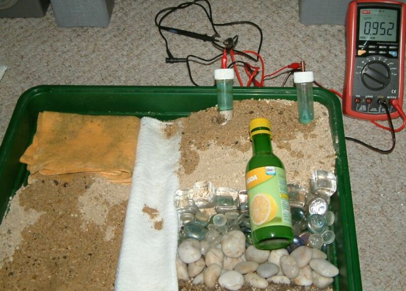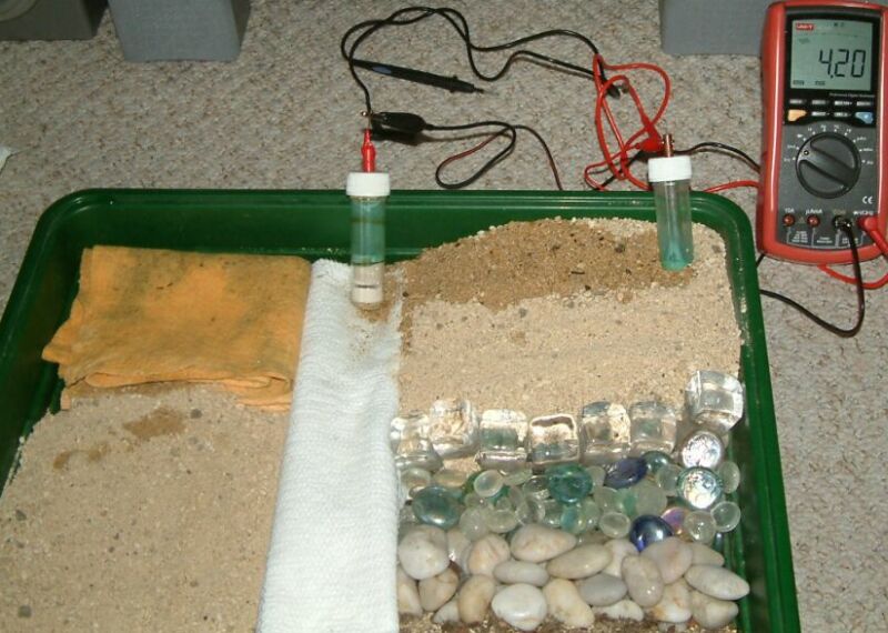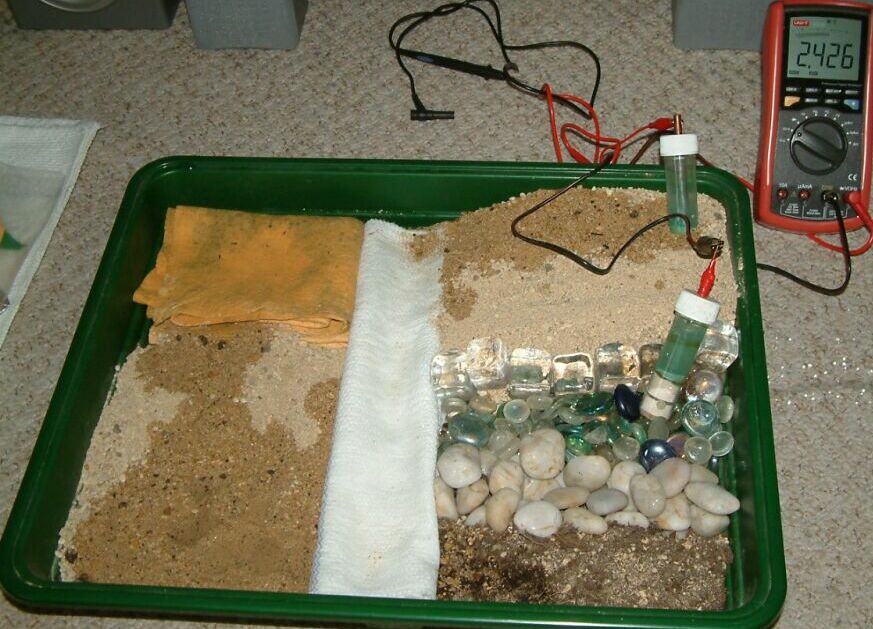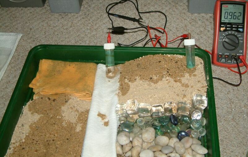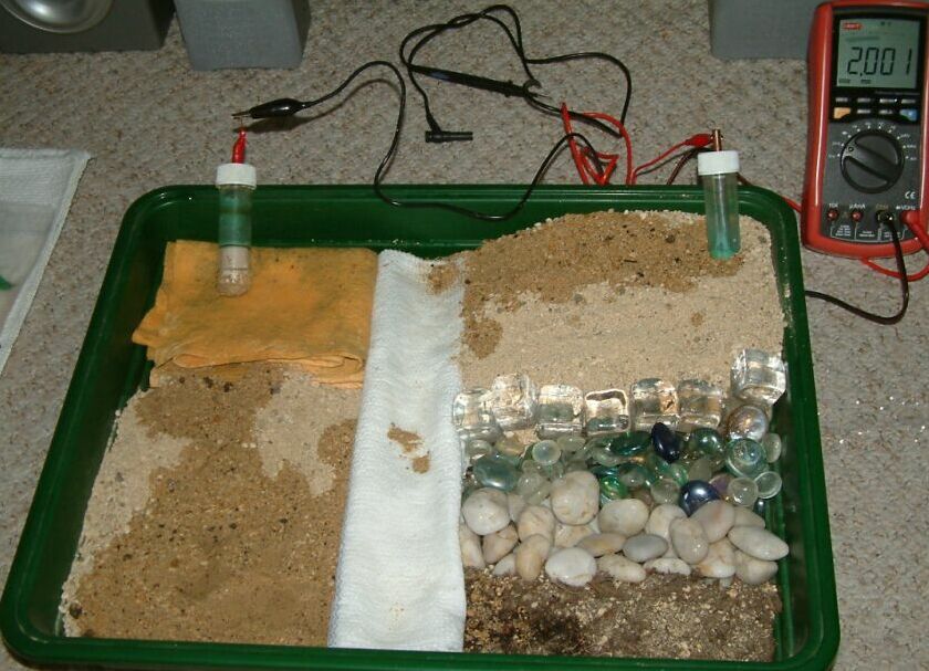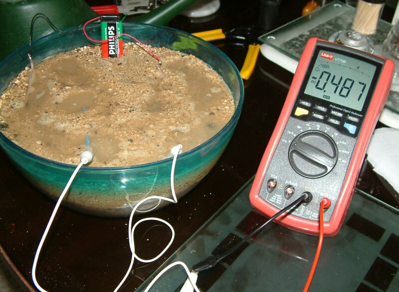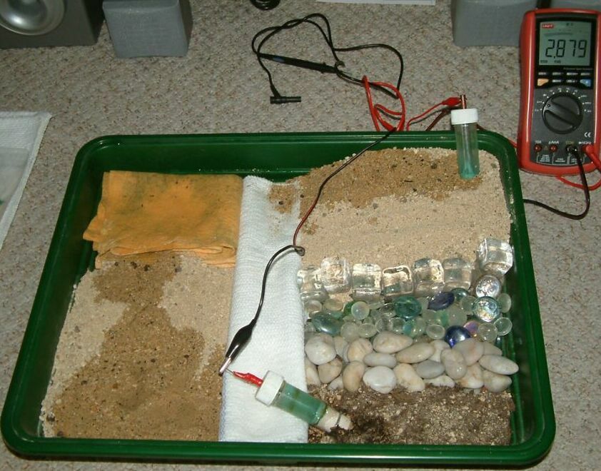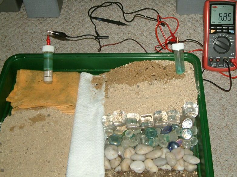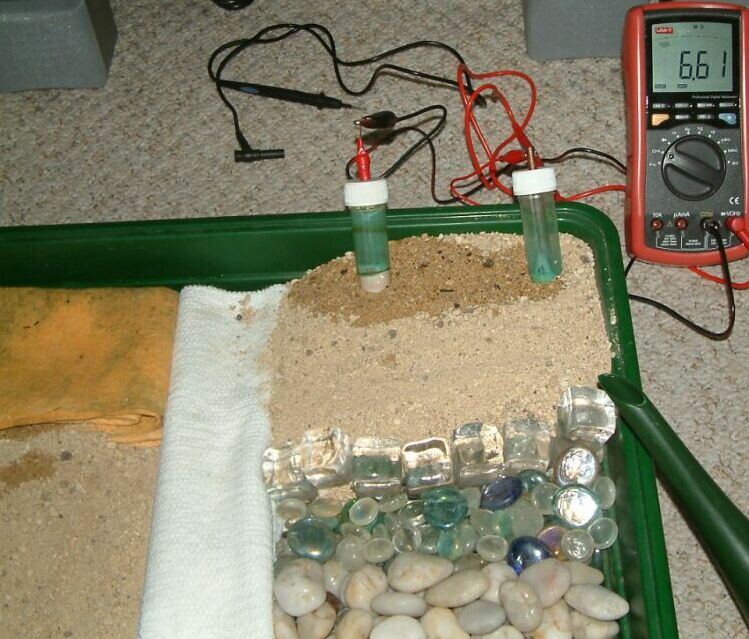 In the picture above, the sand between the half cells has been soaked with tap water. This will have three main functions in conductivity. It will physically improve contact between each particle of sand by actually moving them together. It will disolve the salts that are between the particles of sand and it will have salts from the tap water supply. Eletricity moves through disolved salts.... distilled water is very resistant.