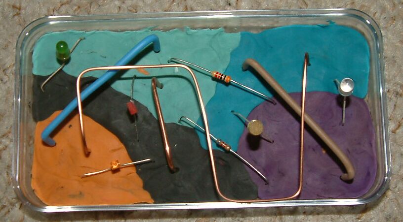 The model shown above is some electrical componenets stuck into a 'pcb' made of modelling clay of different colours.