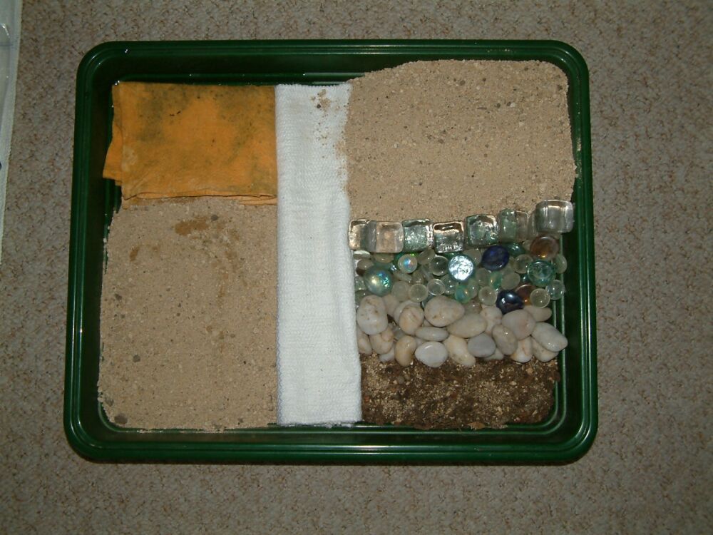 It is placed on the pebbles that are now wet and the surrent is able to provide a resistance reading on the meter.
