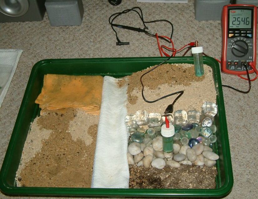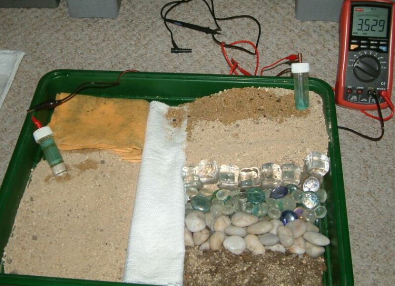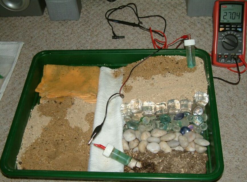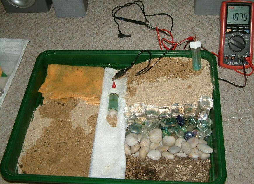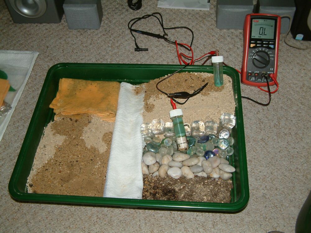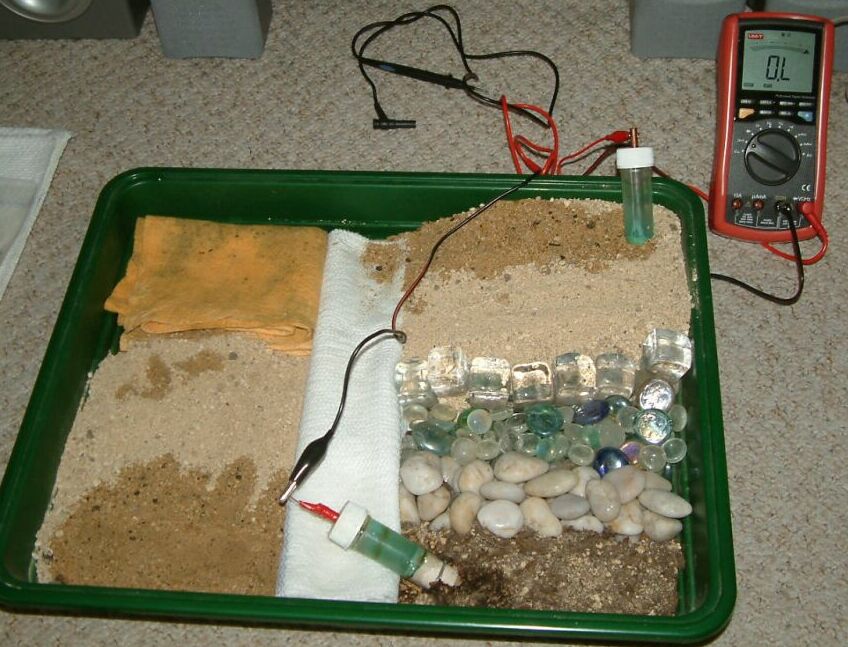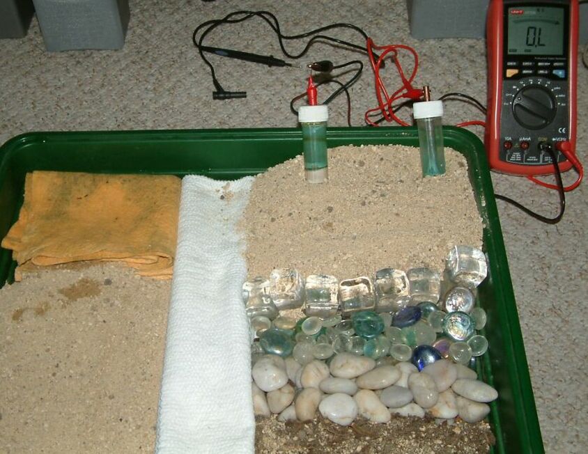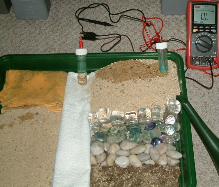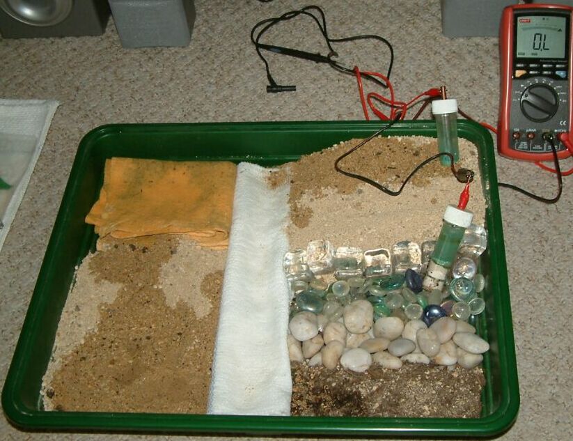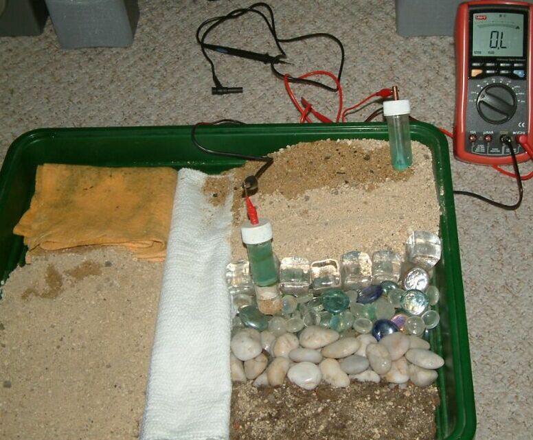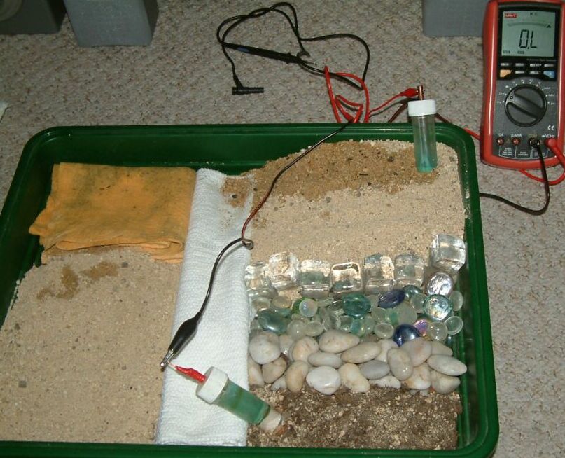 We now wet the glass pebbles and see that we have a reading. It is important to realise that this is a TOTAL RESISTANCE READING between the two points of ground contact. It is as a result of the passage of the current through all of the resistances in parallel... and this is how it must be computed in order to be relevant.