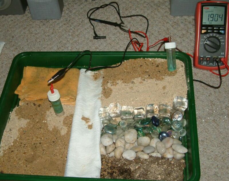 The meter reading can be changed by adding more water, and will change itself as the water soaks in .... the equivalent to rainfall and tidal changes affecting pipeline corrosion.