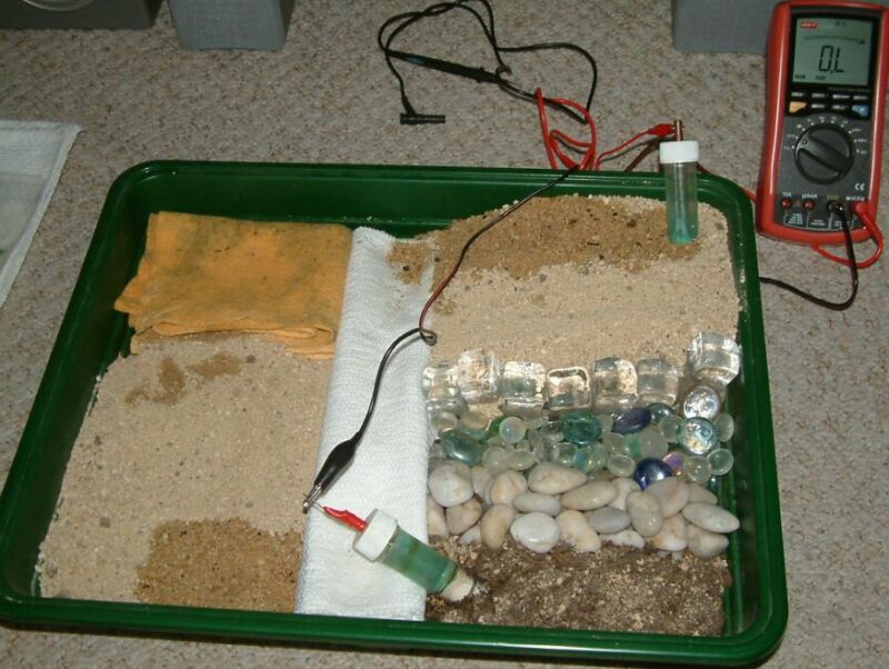 It can be seen that water has been added to an area in the sand but this has not changed the reading on the meter. There is still insufficient conduction between the two half-cells to allow a meter reading.