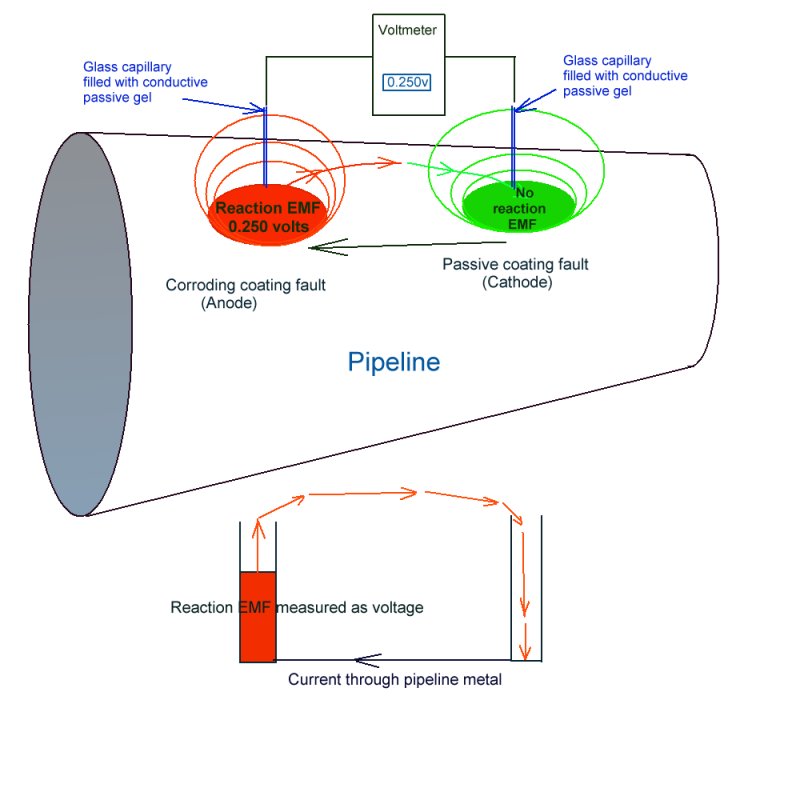 The corrosion current will pass through the pipeline metal from the cathode to the anode, from which it passes into the earth electrolyte. The direction and strength of the currents within the metal, depend on the location and size of each coating fault as well as the EMF generated by each individual corrosion reaction.
