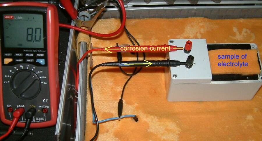 As the corrosion reaction is the sole cause of the original reading on the meter, then it may be safely reasoned that the reaction has stopped when this current has stopped.