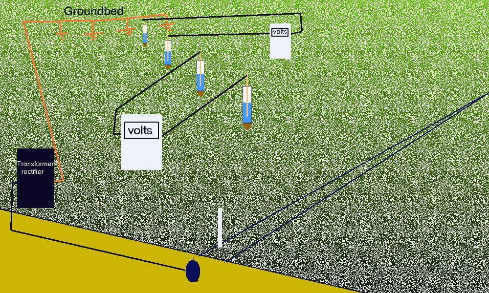 The potential of the bright steel anode is made equal to that of the pipeline through a low resistance conductor.