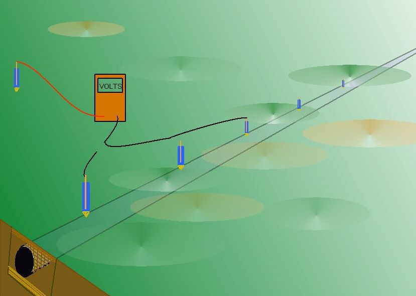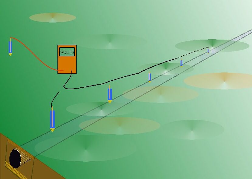 4.3.1. Contact the ground with the roving electrode, at one meter intervals along the path of the pipeline, noting the voltage readings between the electrodes, at each step.4.3.2. The locations of highest voltage should be marked.