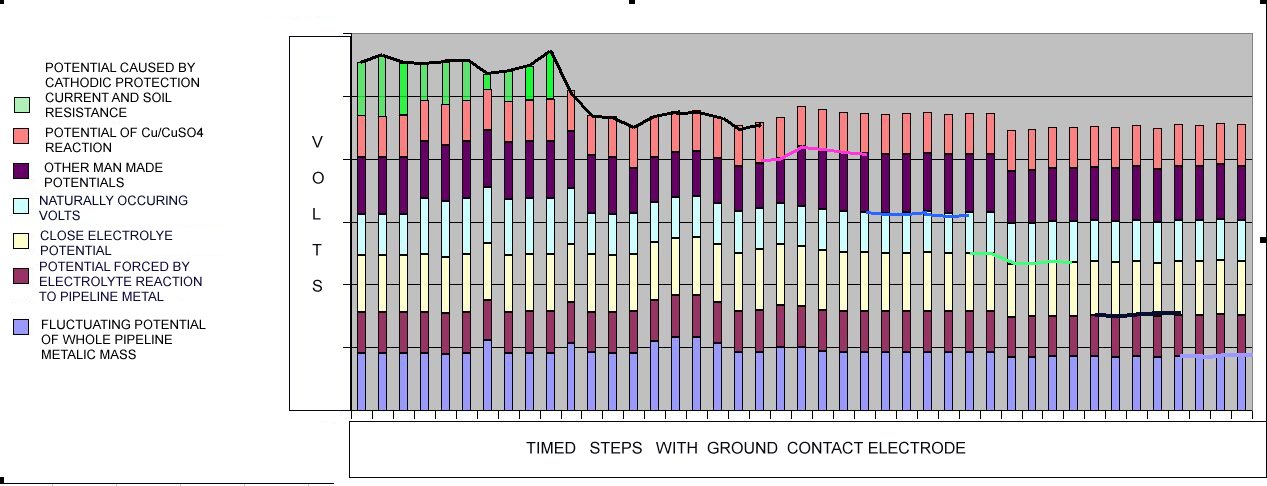 This graph just shows voltages recorded at time intervals and sometimes synchronised through the GPS satelite system to the switching mechanism at the source of the cathodic protection current.