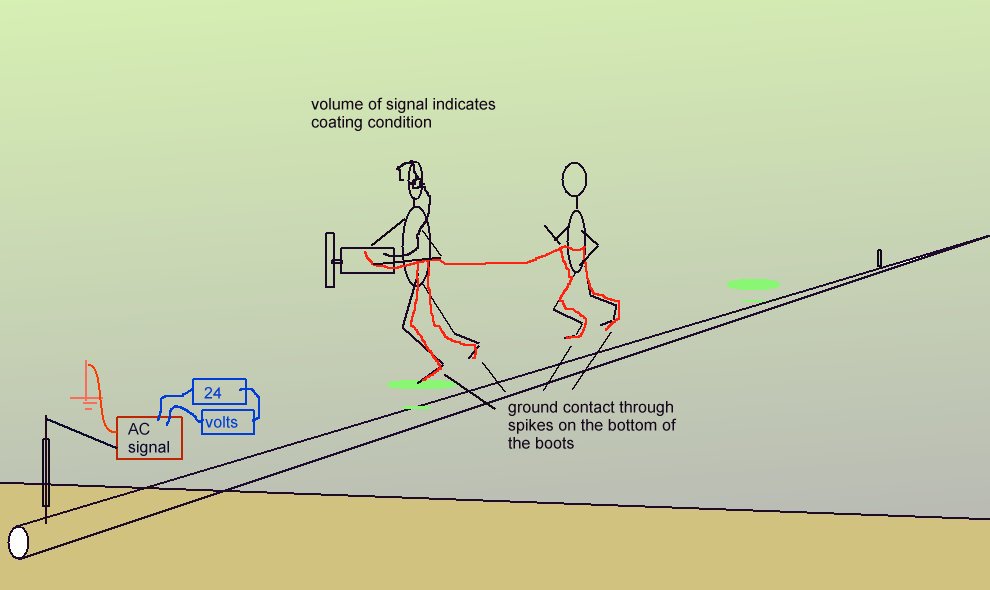We used a Pearson type instrument for pipe location and to give a secondary indication of the positions of coating faults. This equipment was supplied with earphones through which the operator judges the volume of the monotone that was impressed into the pipeline at the nearest metalic contact point.