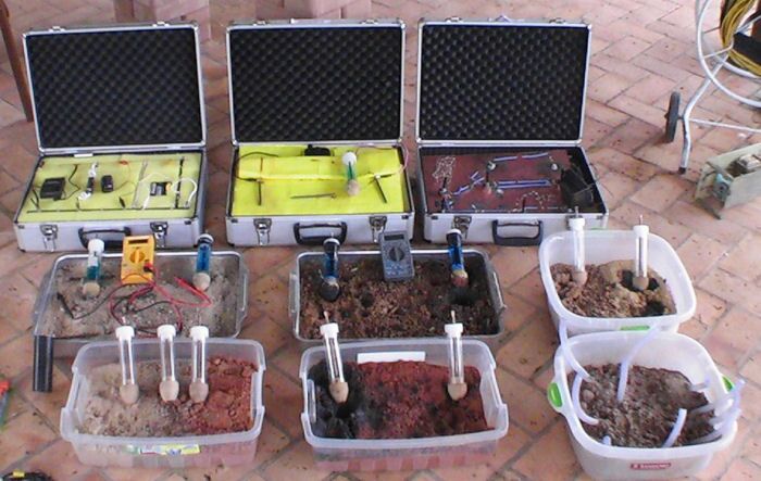 Move the positive connection of the digital meter progressively down the row of wires labelled 'moving half-cell down excavation', noting each reading. Note that the readings reduce as the resistance between the electrode and the pipeline reduces. This can be regarded as a different effect from that of a resistance in the measuring circuit. Here we are looking at the true voltage measurement and not an error due to the inefficiency of the meter.