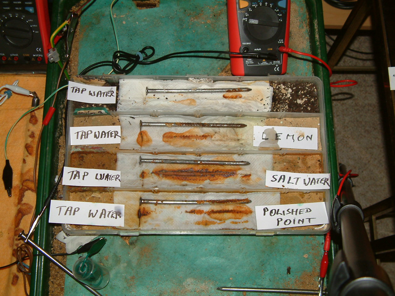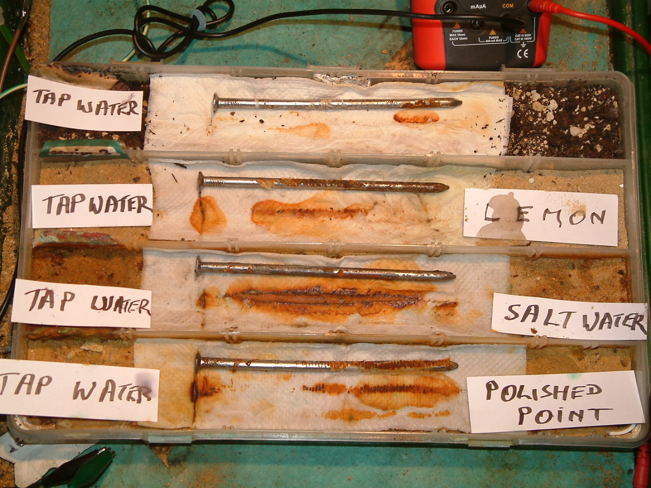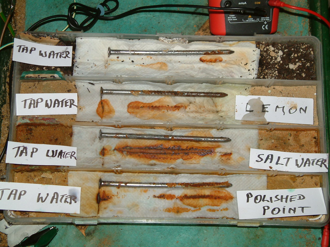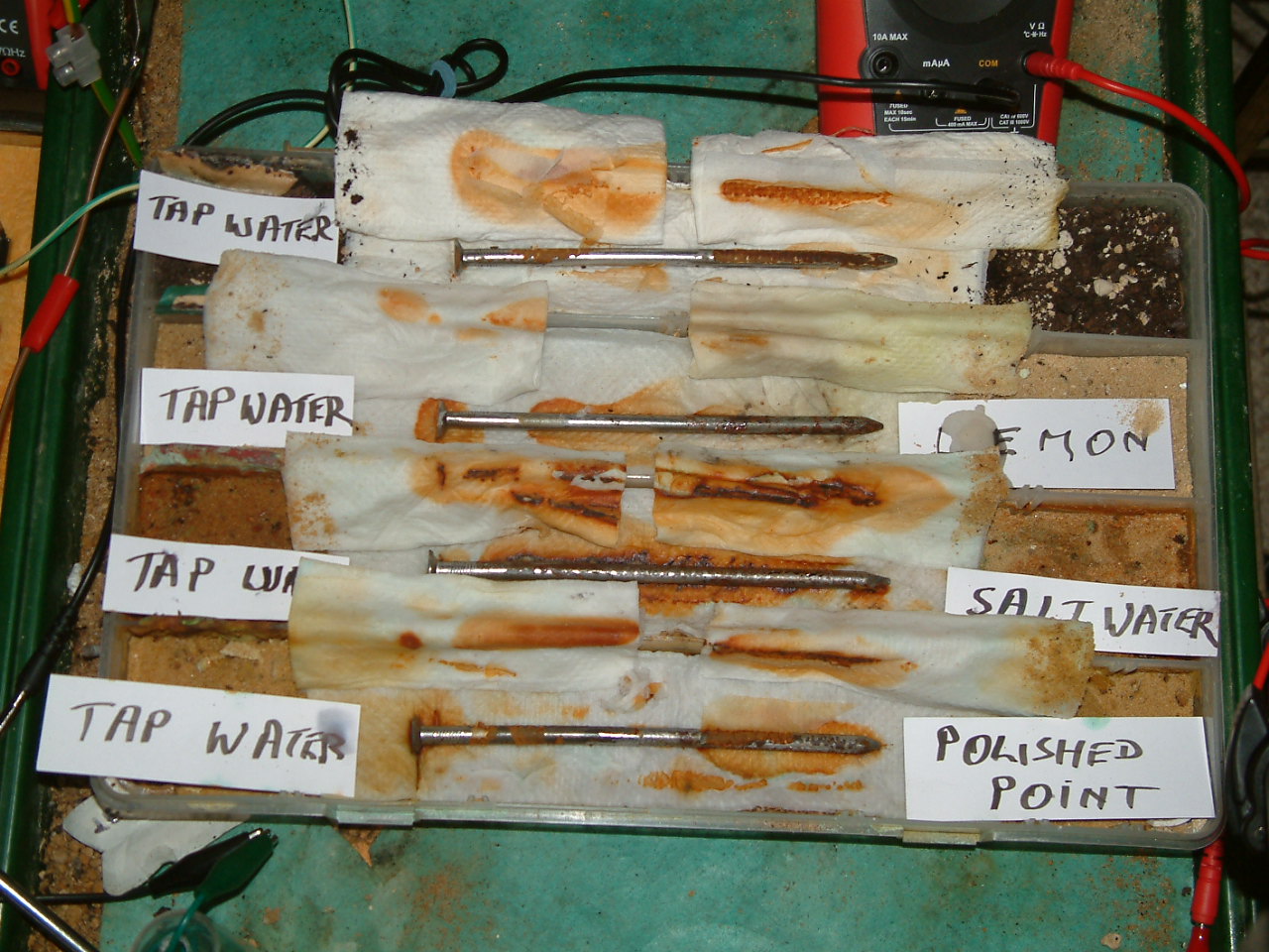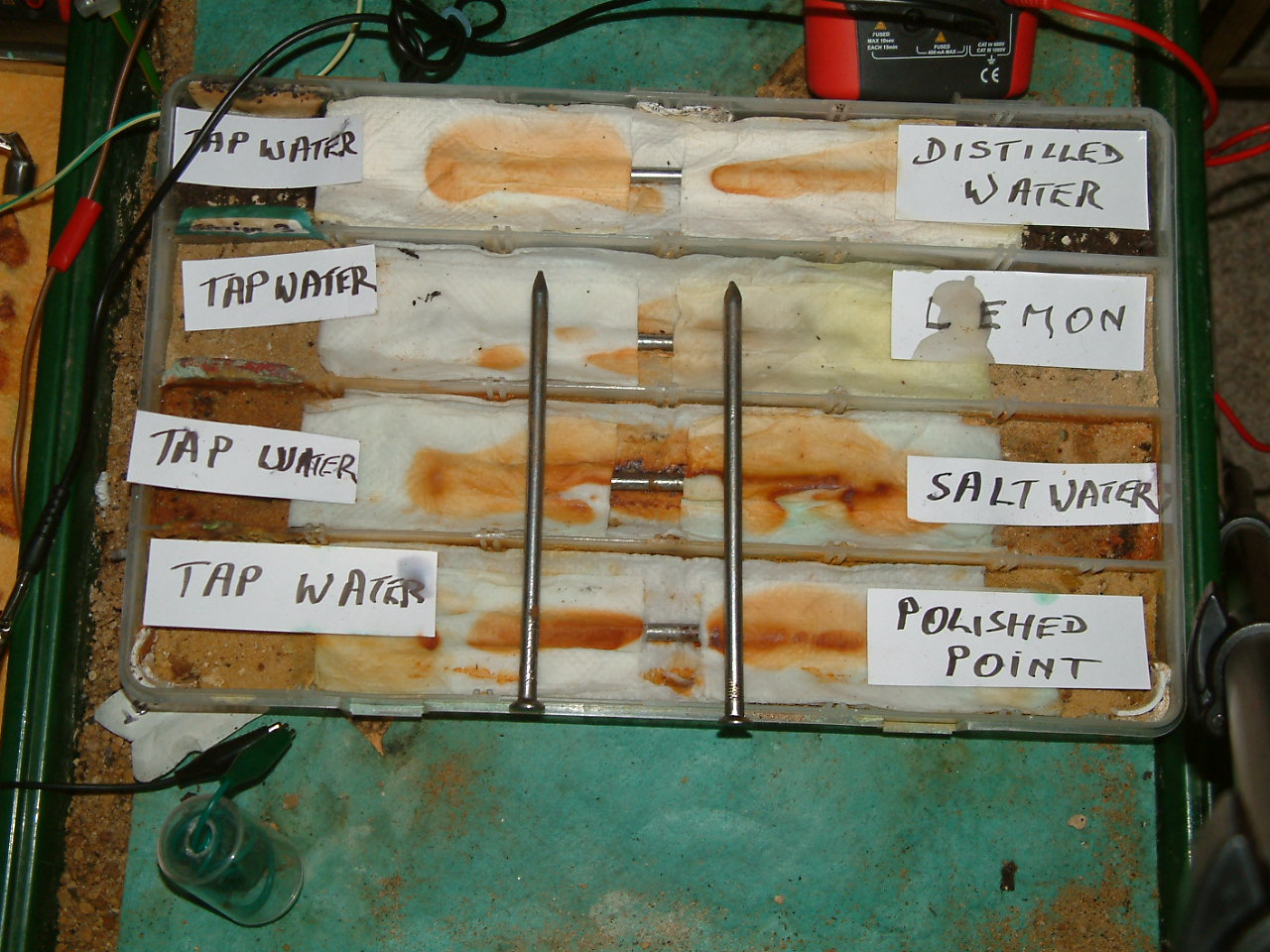 The next four pictures show the voltages between two nails when they are ontacting the electrolyte in which the subject nails can be seen to be corroding.