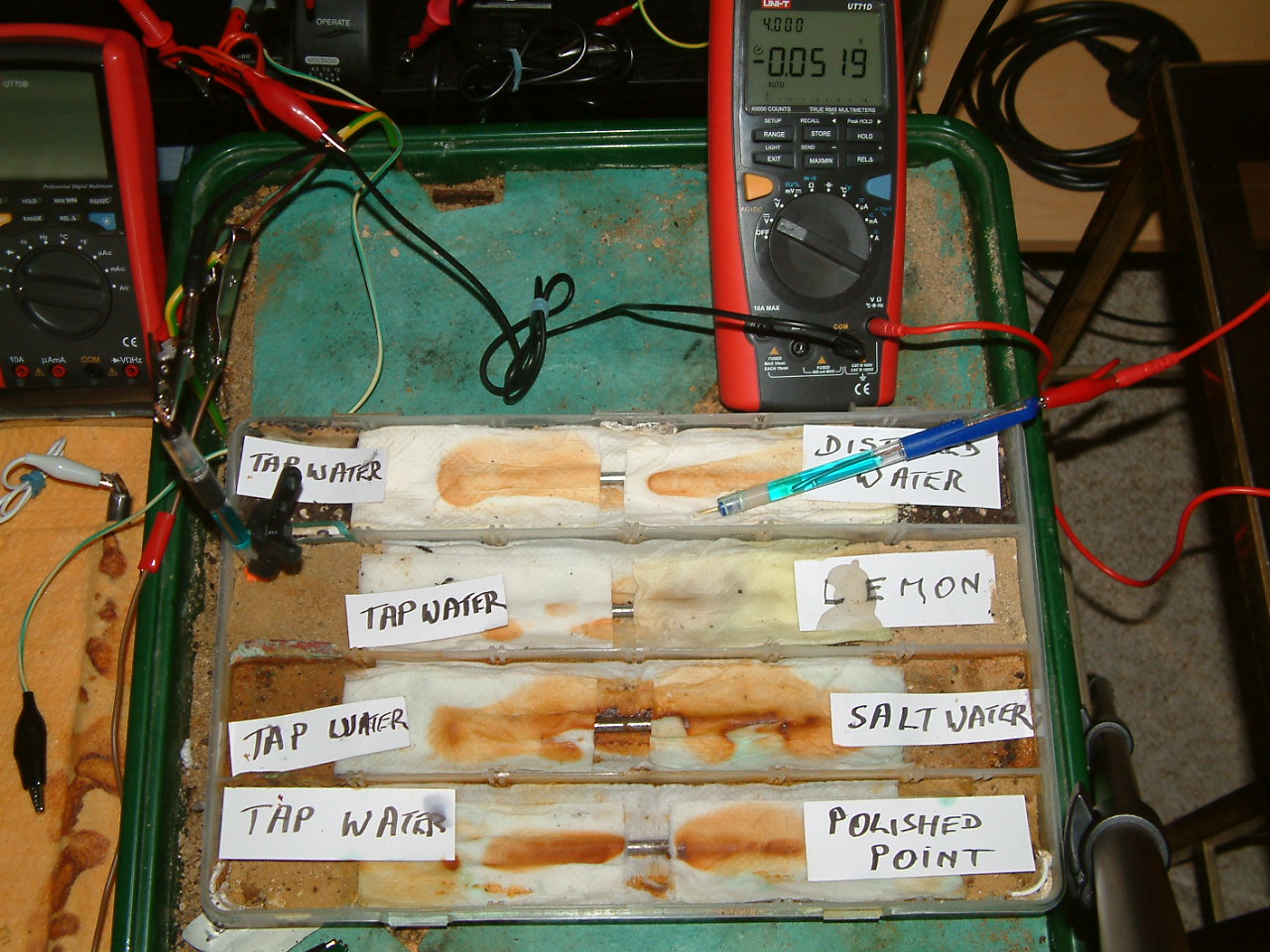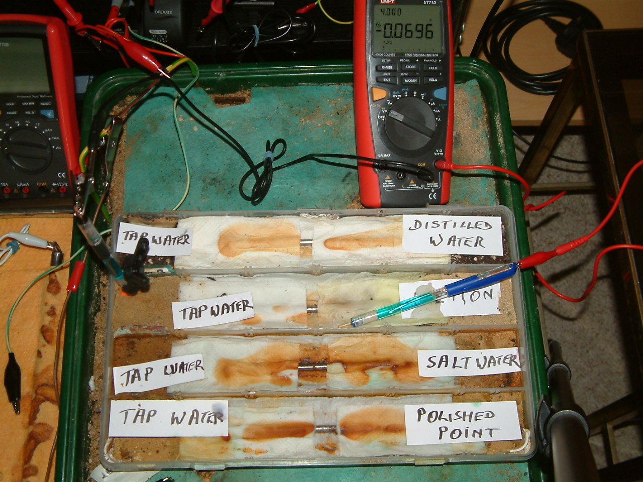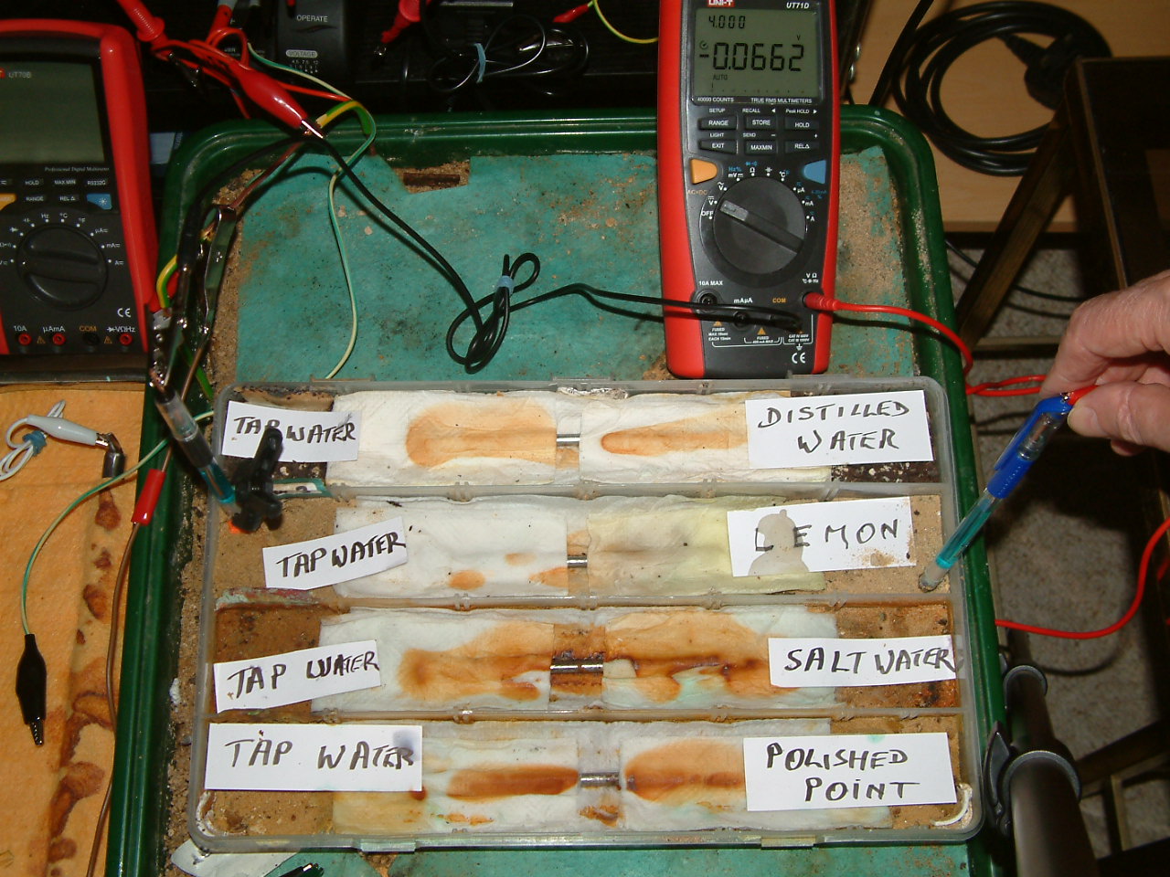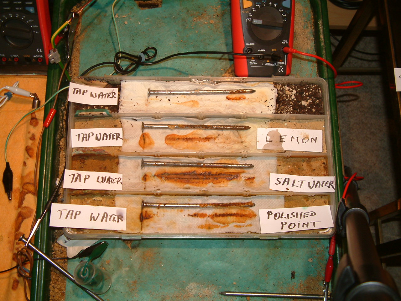 The next four pictures show the voltages between two nails when they are ontacting the electrolyte in which the subject nails can be seen to be corroding.