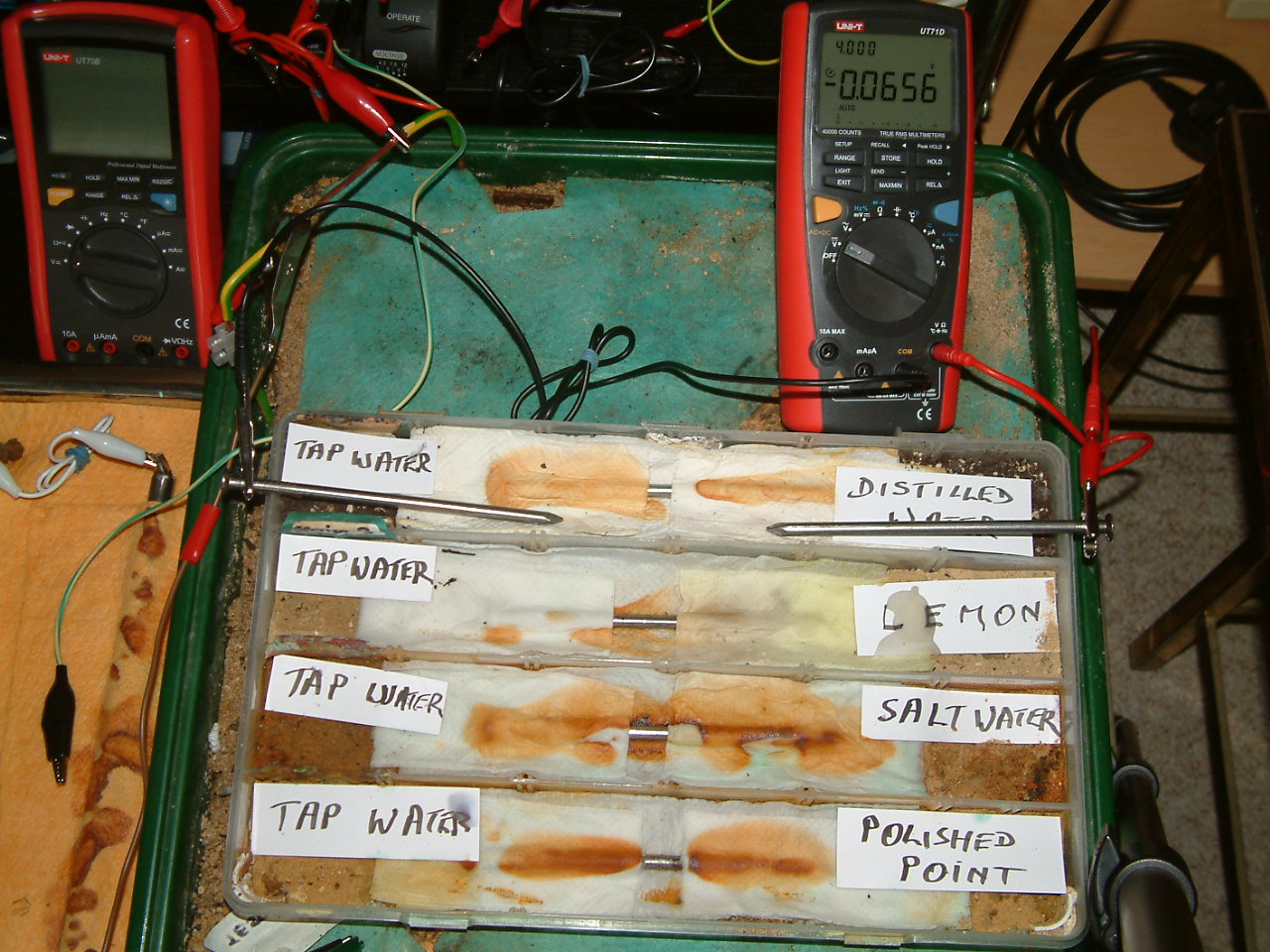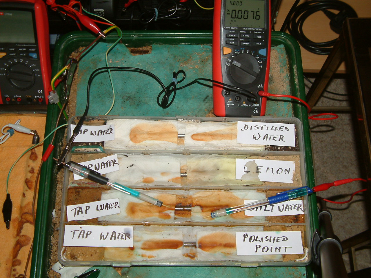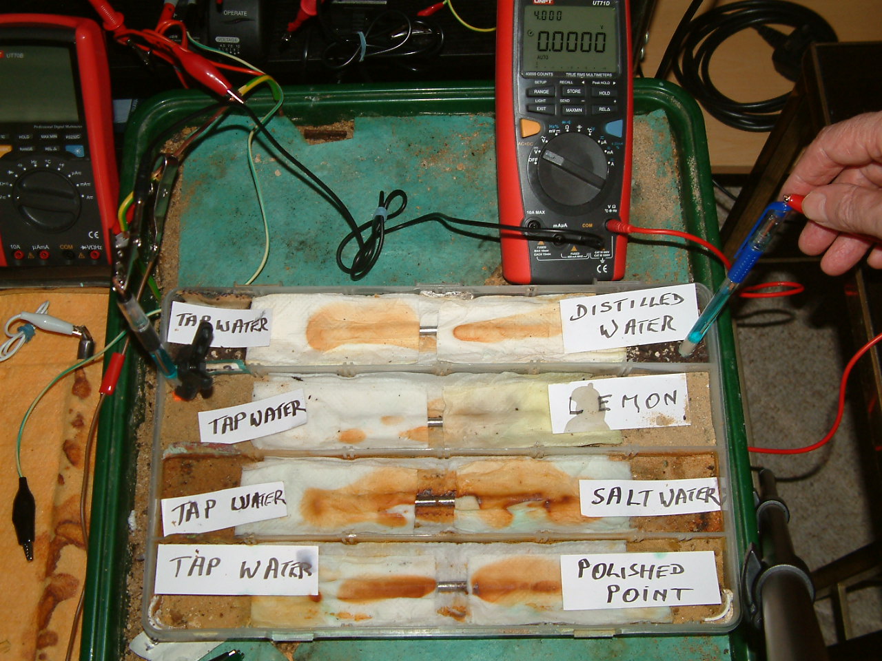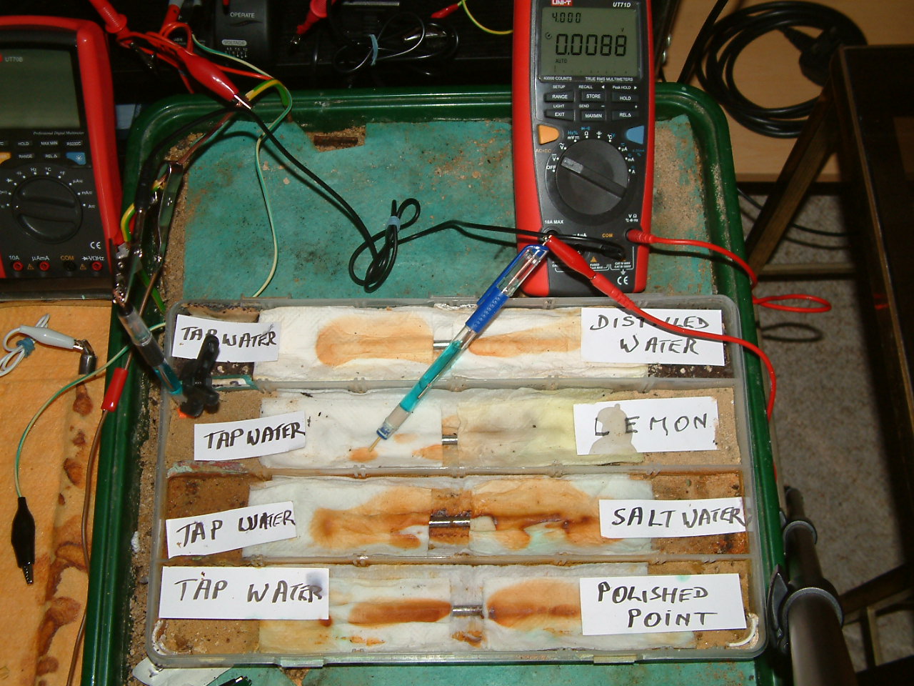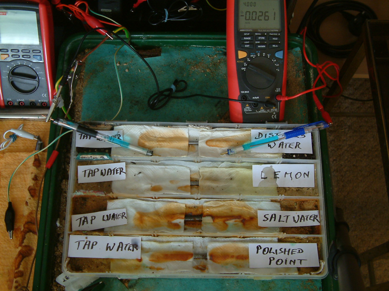The next four pictures show the voltages between two nails when they are ontacting the electrolyte in which the subject nails can be seen to be corroding.