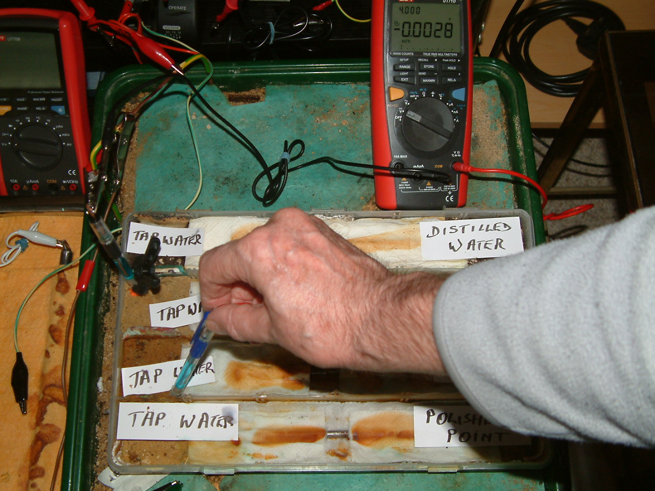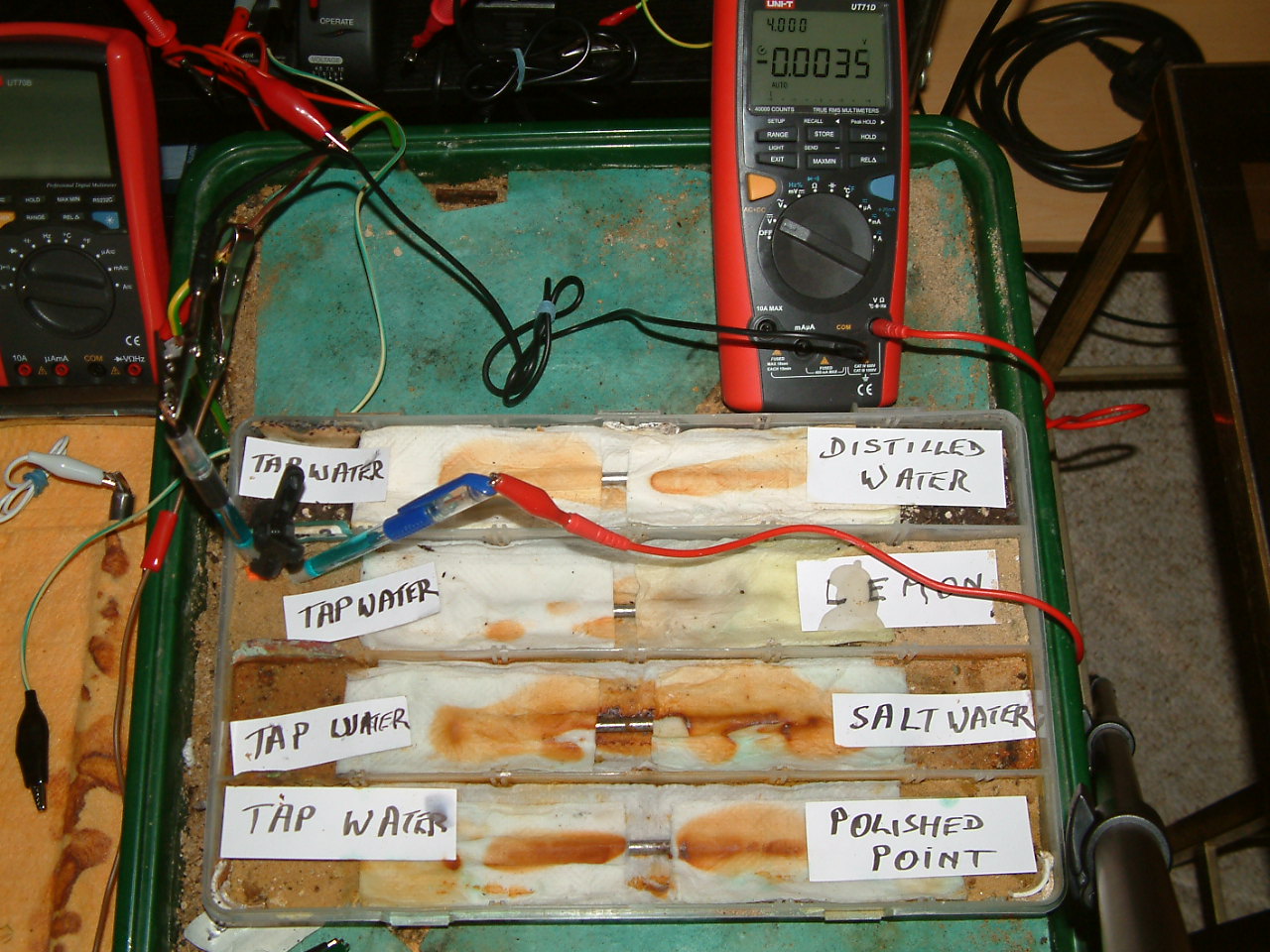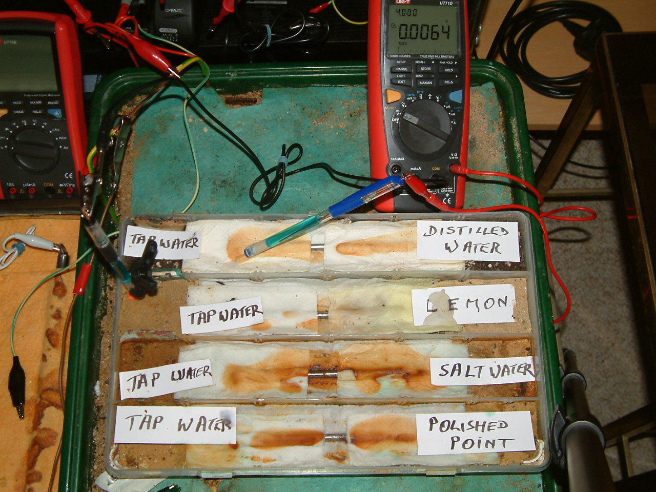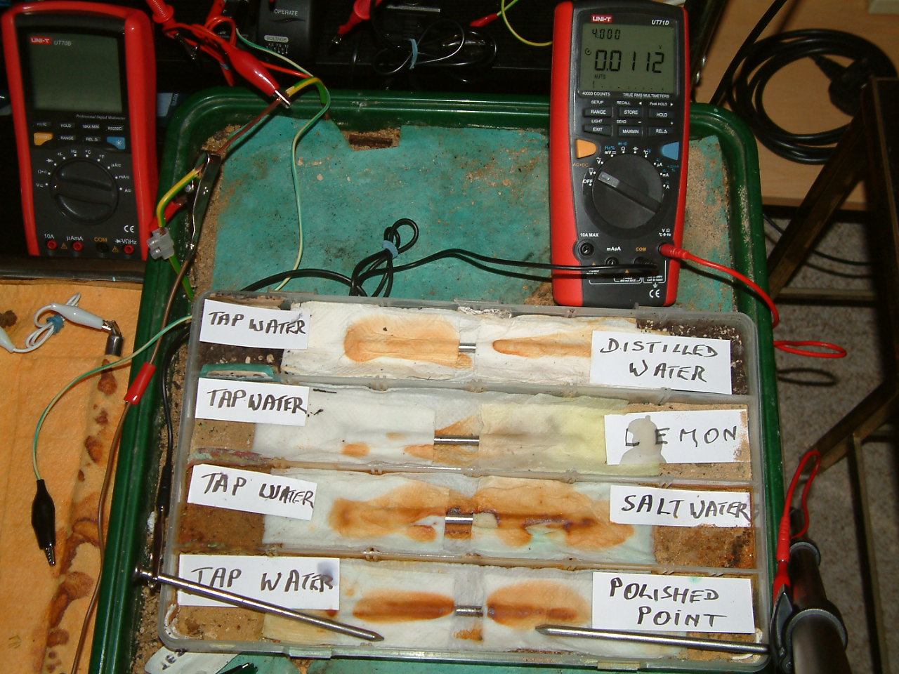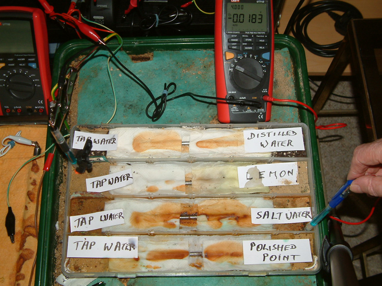 The next four pictures show the voltages between two nails when they are ontacting the electrolyte in which the subject nails can be seen to be corroding.