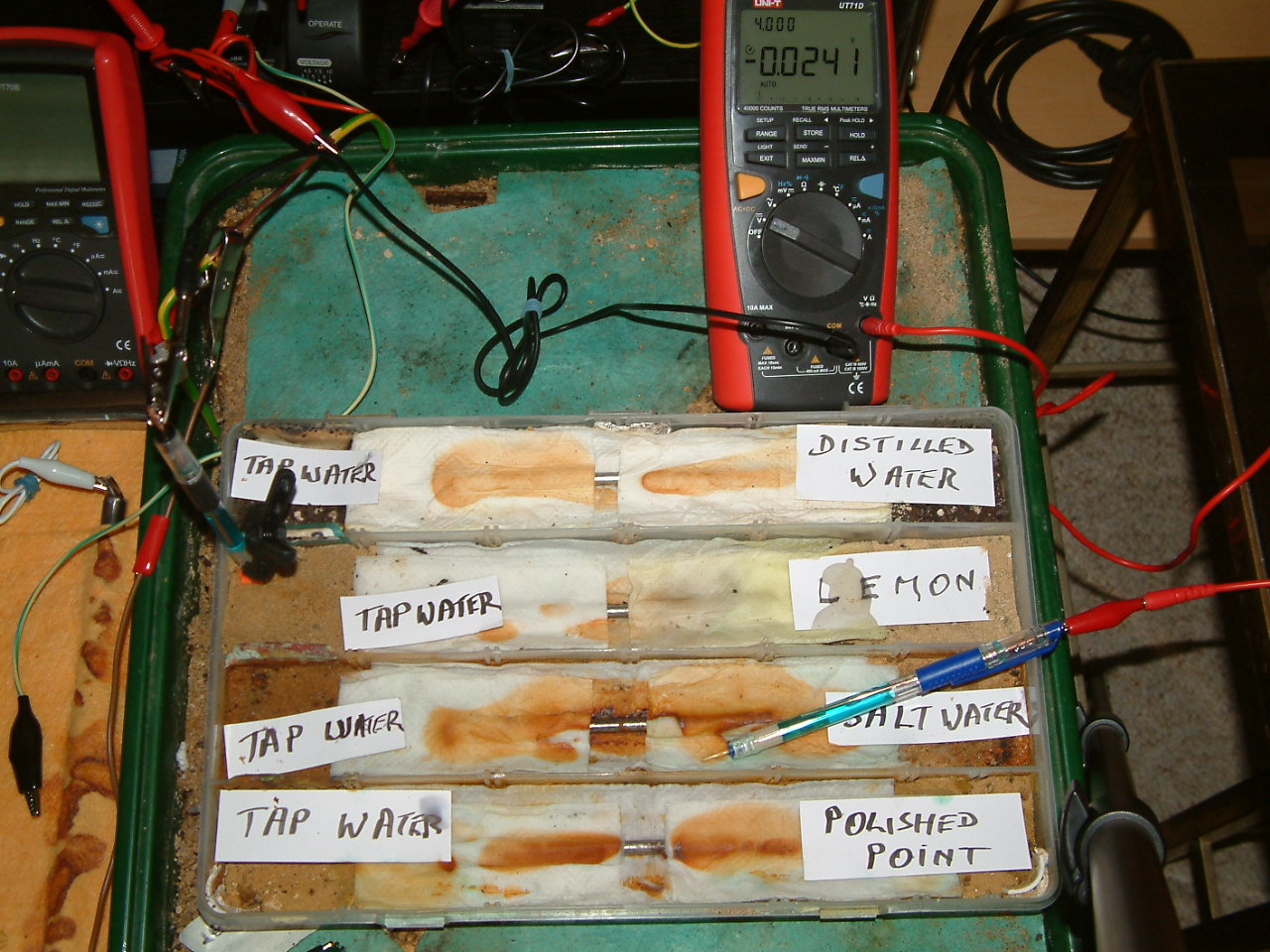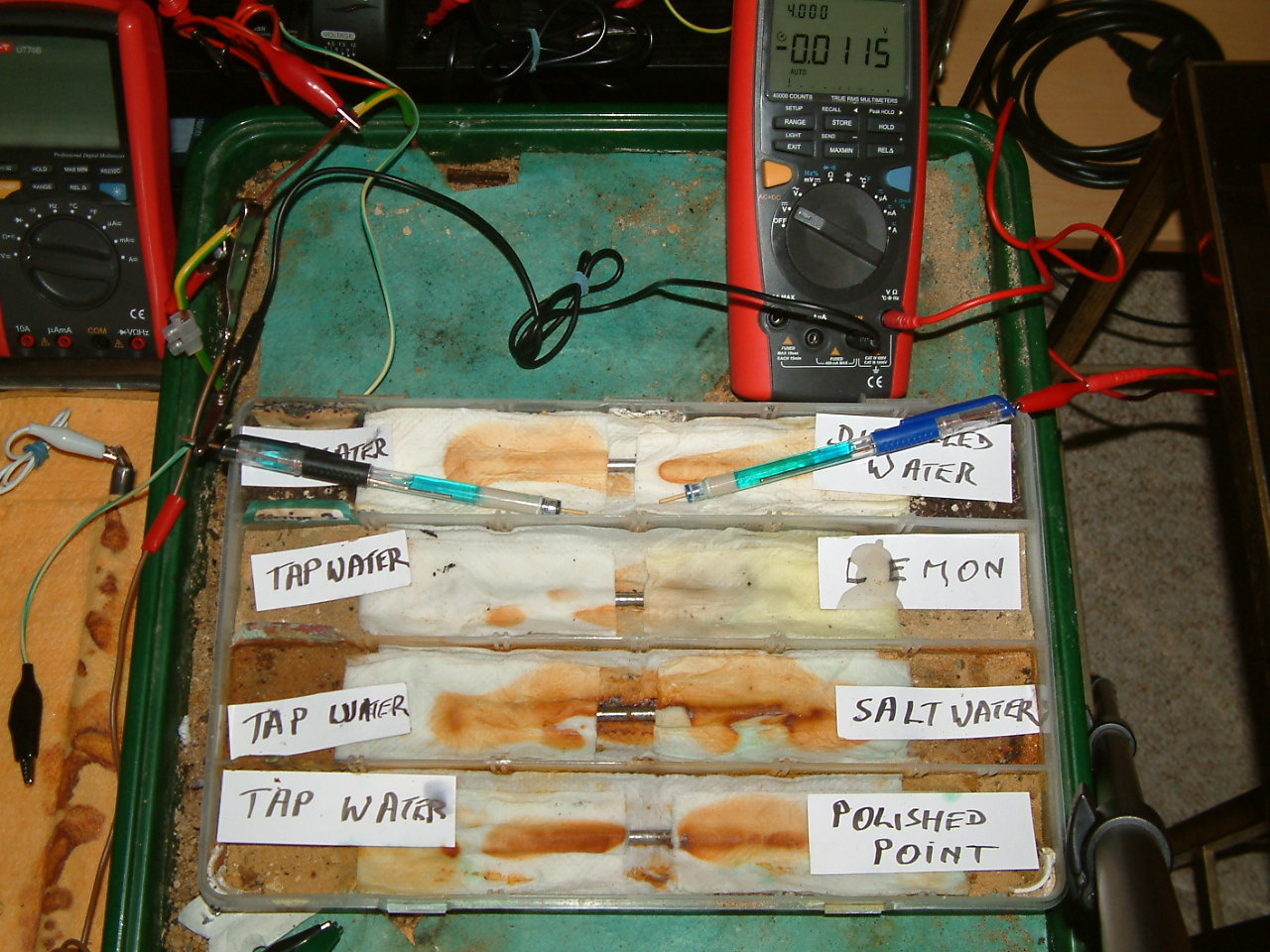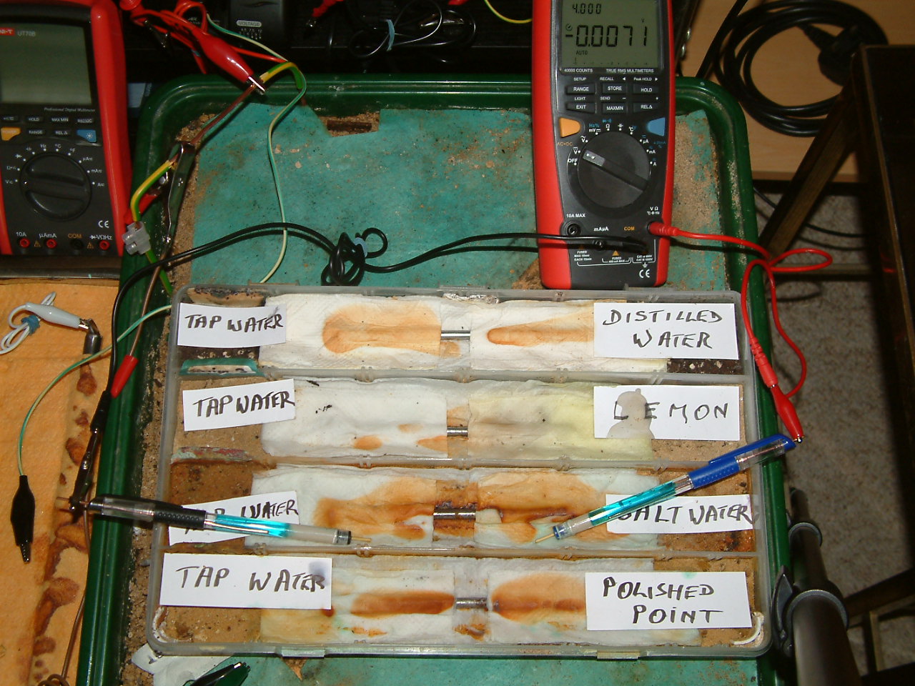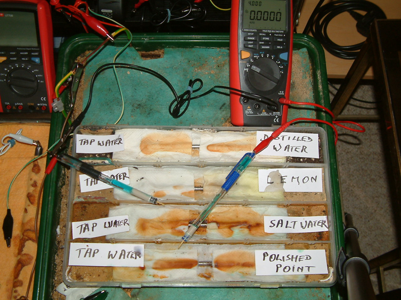 The next four pictures show the voltages between two nails when they are ontacting the electrolyte in which the subject nails can be seen to be corroding.