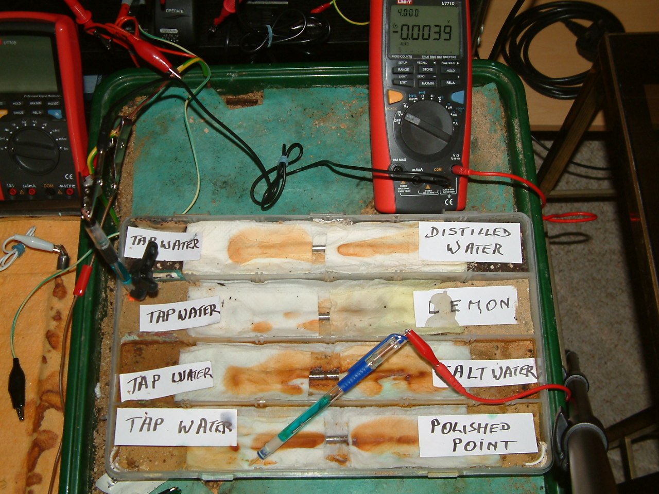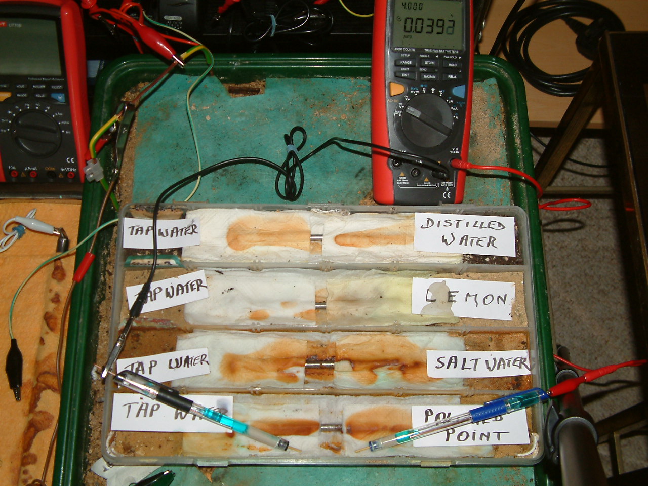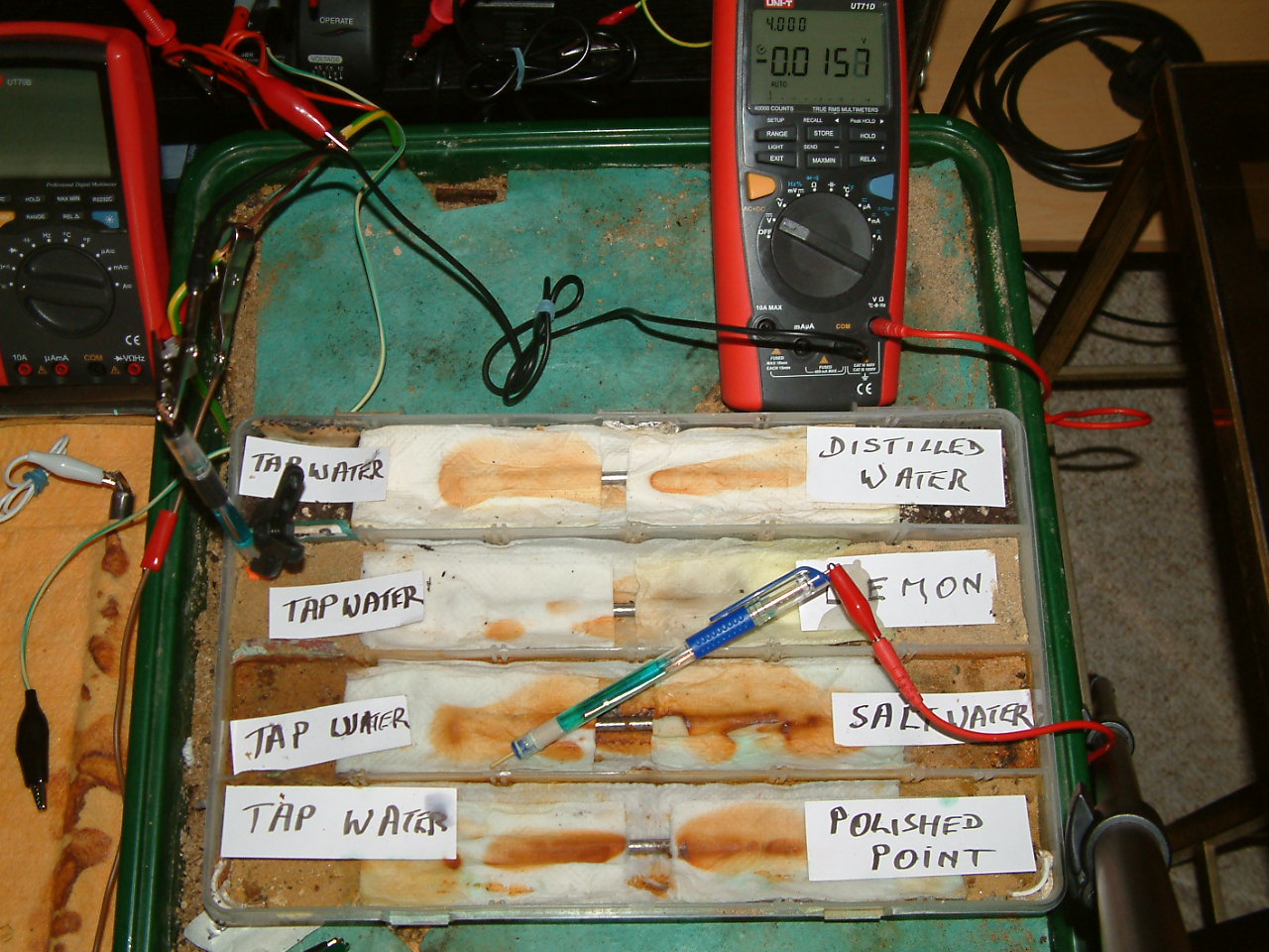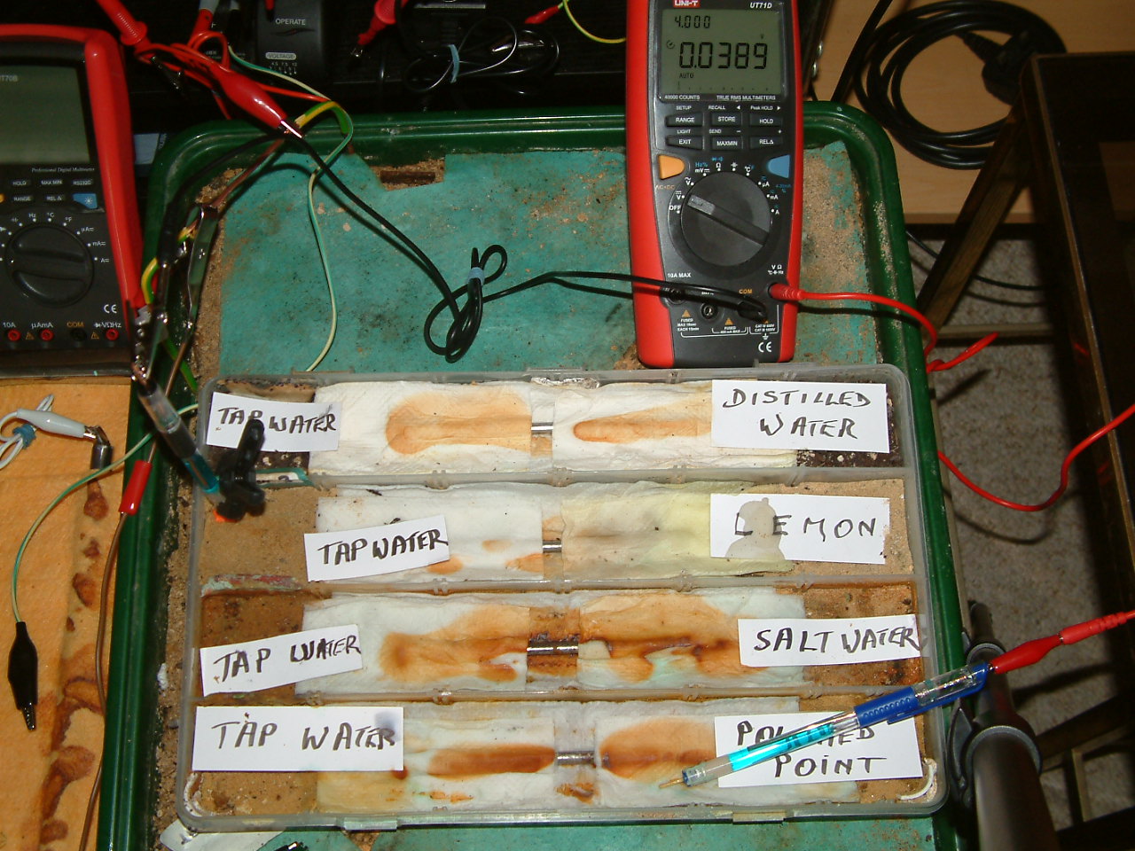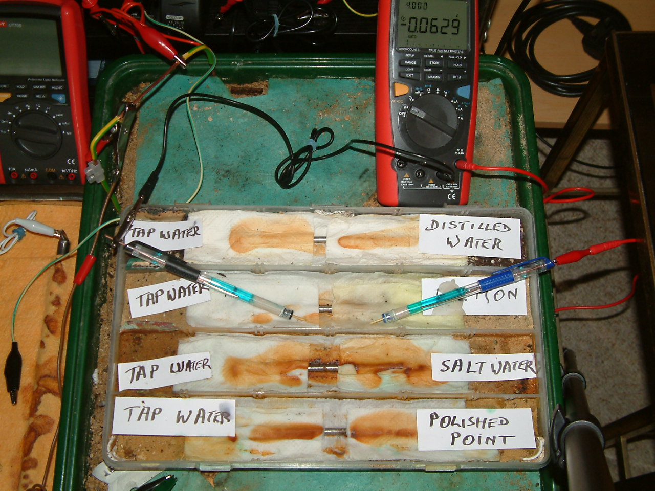 The next four pictures show the voltages between two nails when they are ontacting the electrolyte in which the subject nails can be seen to be corroding.