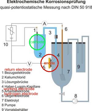This reaction potential is added to the potential of the electrolyte at both contact points. The potential of the electrolyte is due to other 'electrical pressures'. This is similar to the measuring circuits that we encounter in applied cathodic protection.