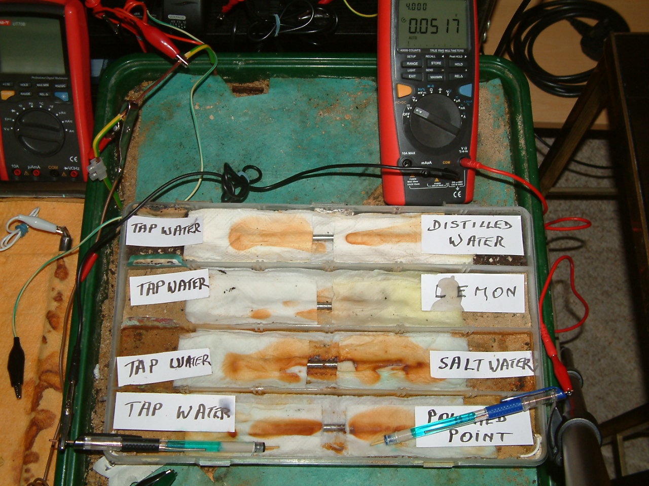 In the pictures that follow the Luggin probes are used to contact the electrolyte instead of the probe nails. The potential difference between the two contact points in the electrolyte is 0.0517v. The common of the meter being zero and connected to the Luggin capillary on the left hand side of the picture, there are more charges on the right hand point of contact thus giving a + positive display.