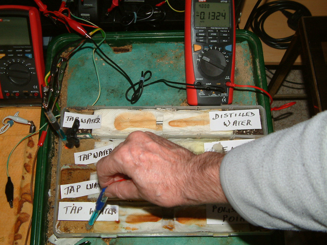 In the picture above we see there is no voltage and this is because the roving probe did not make good enough contact with the electrolyte for the charges to drive the meter.
