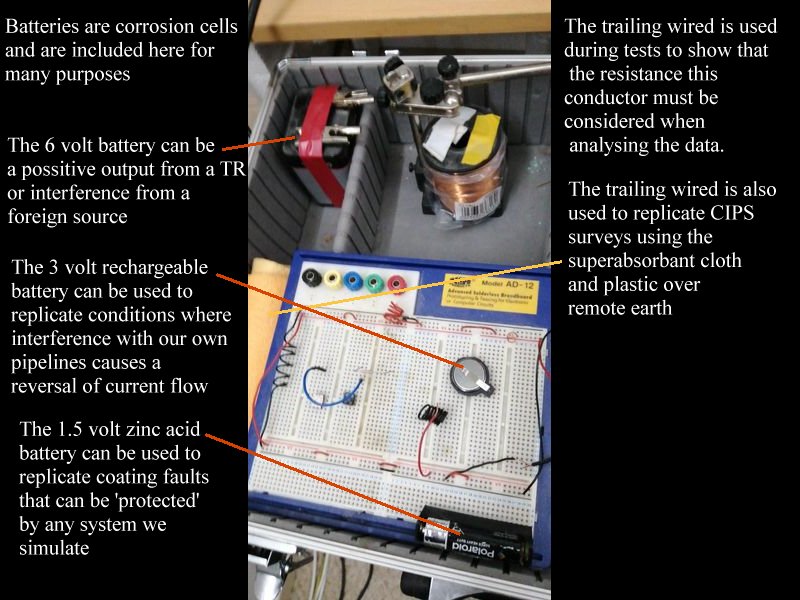 Batteries are corrosion cells and are therefore useful to investigate the real effects of the impressed current on corrosion cells in a variety of configurations on the breadboard and the remote earth board. |