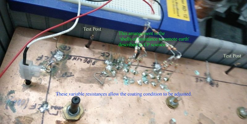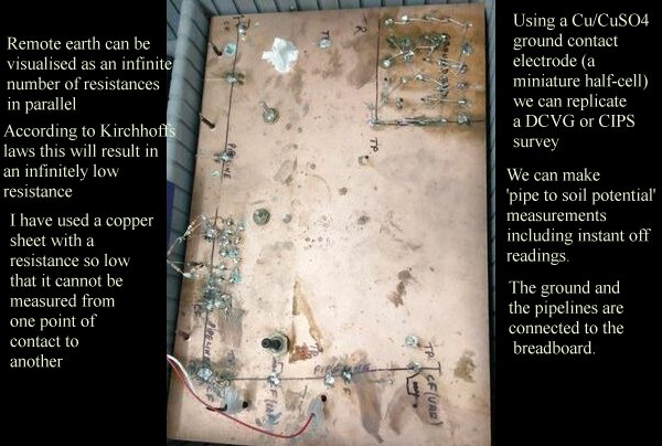 There is also an arrangement of electronic resistors that demonstrates that the placement of the ground contact electrode (known as a half-cell) changes the measurement known as the 'pipe-to-soil potential'. This shows the 'shell of resistances' described by many cathodic protection scientists. |